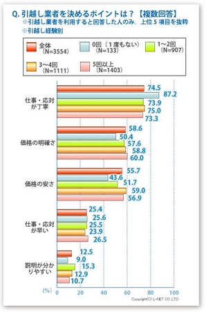 それでは引越し業者は、どんな基準で選ばれるのでしょうか。結果は、「仕事・応対が丁寧」が首位で74.5%、2位「価格の明確さ」58.6%、3位「価格の安さ」55.7%となりました。特に、1位の「仕事・応対が丁寧」は、引越し経験者に比べ未経験者の値が15ポイント以上高くなっており、特に未経験者にとっては重要視されていることがわかります。