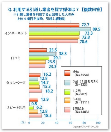 引越し時に引越し業者を使うと回答した人に対して、どのような情報源で探すのかを聞いたところ、「インターネット」72.7%、「口コミ」25.5%、「タウンページ」16.2%の順になりました。「タウンページ」や「リピート利用」は経験者ほど高くなり、逆に、「口コミ」は経験者ほど低くなりました。