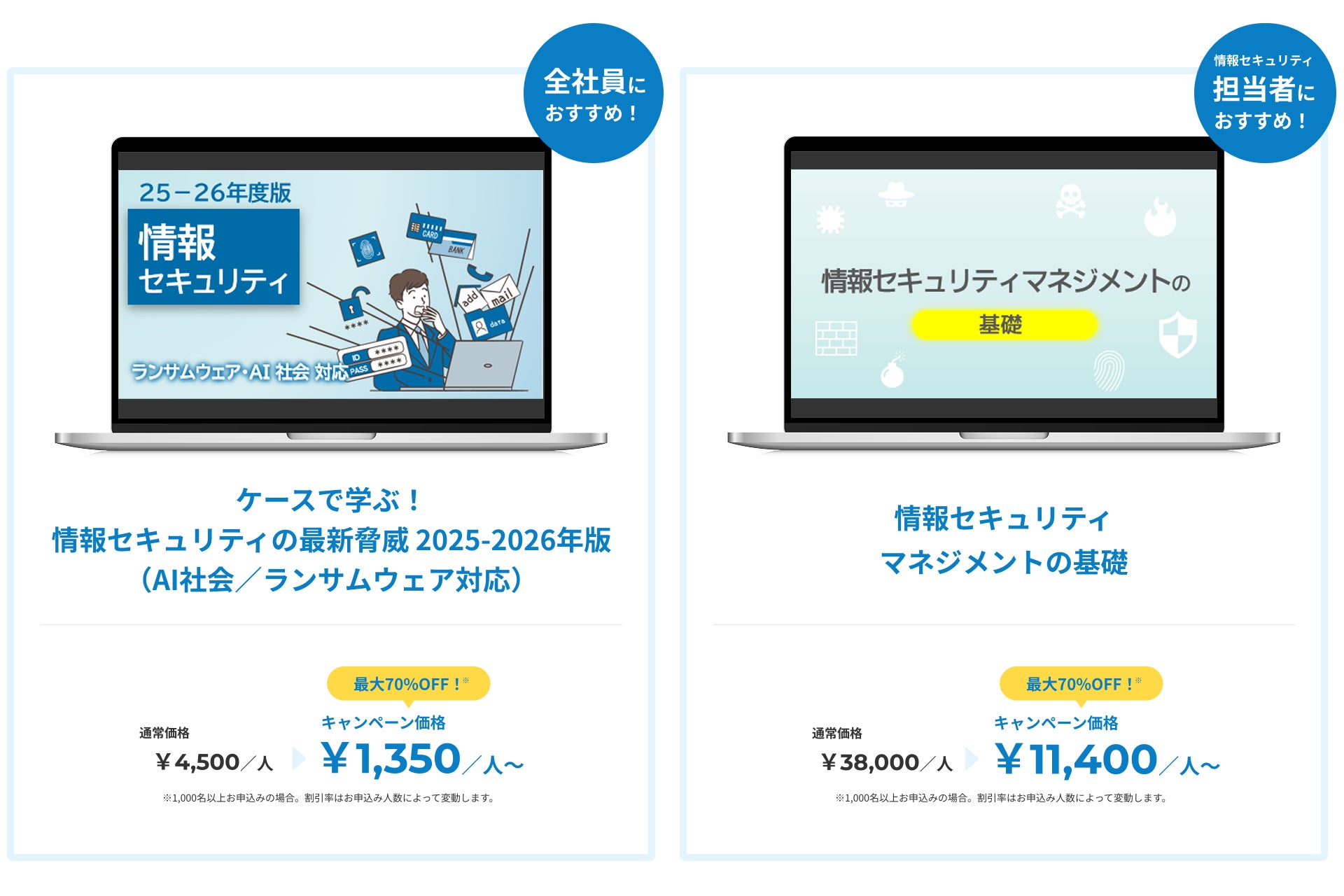 株式会社ネットラーニング(本社:東京都新宿区、代表取締役:岸田徹)は、2025年12月4日(木)より、企業向け情報セキュリティ eラーニング2コースを対象にした最大70%割引キャンペーンを開始いたします。