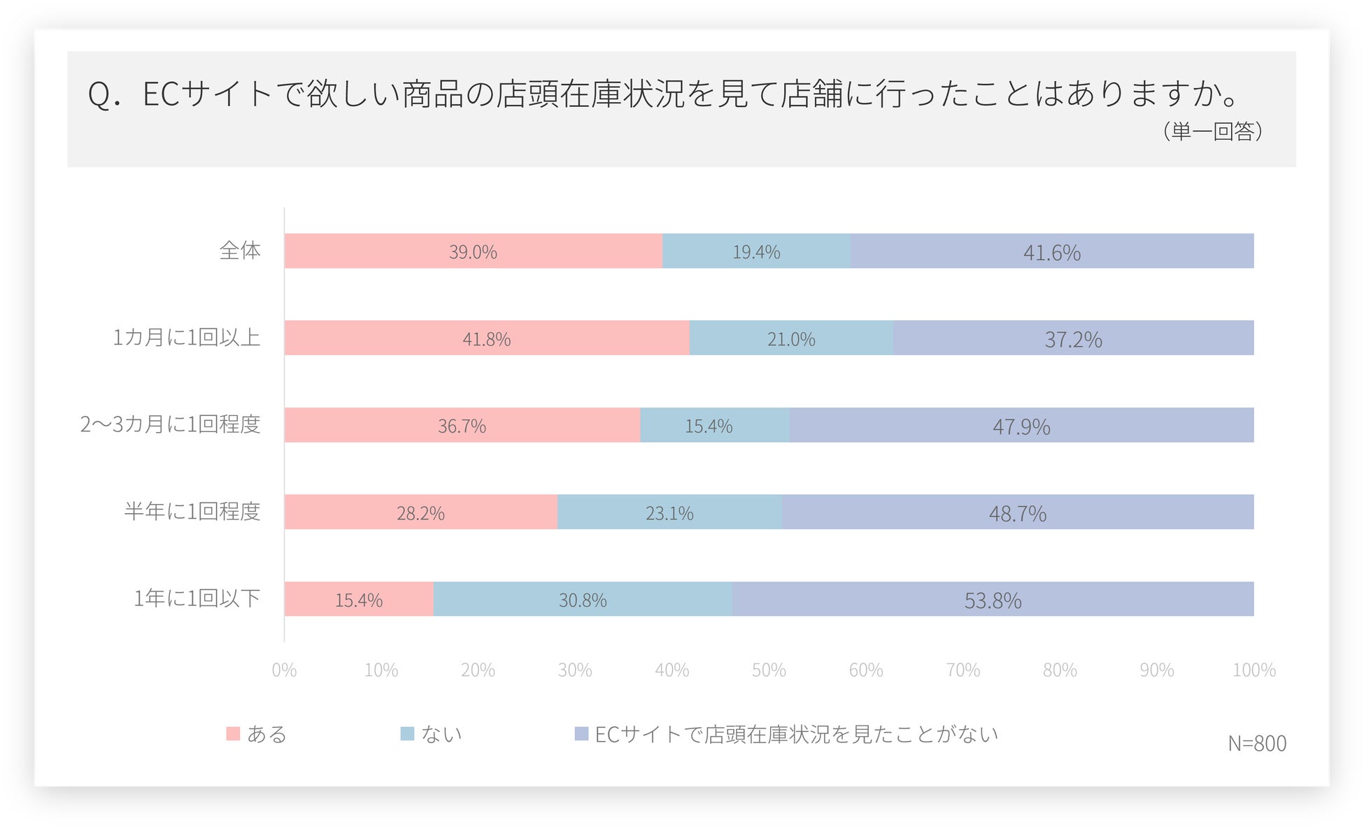 回答者800名のうち、ECサイトで商品の店頭在庫状況を見て店舗に行ったことがあるのは39%。41.6%がECサイトで店頭在庫状況を見たことがなく、19.4%はECサイトで店頭在庫状況を見たことはあってもその情報をもとに店舗に行ったことはないと回答しました。
