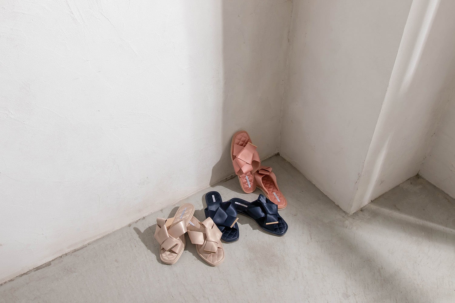 サテンキルティングの控えめな光沢感が上品な1足となっております。