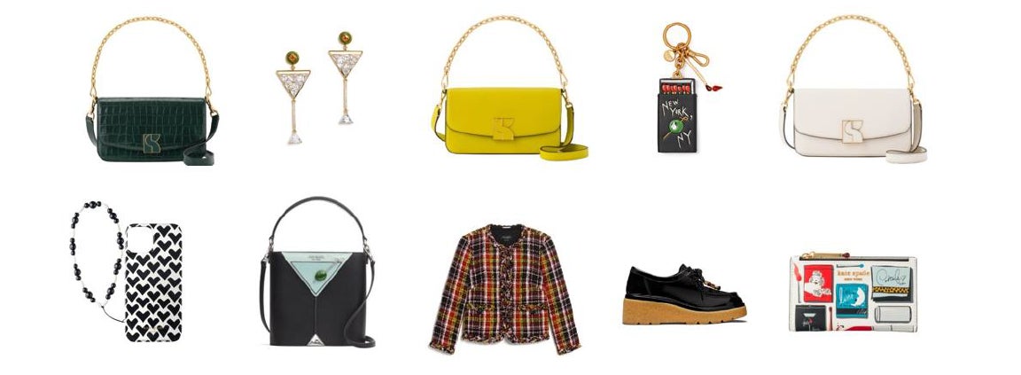 左上から、kate spade dakota croc-embossed small in rock garden, H12xW22xD7cm ¥73,700, shaken or stirred statement earrings ¥37,400, kate spade dakota small crossbody in chartreuse, H12xW22xD7cm ¥61,600, perfect match matchbook key fob ¥20,900, kate spade dakota small crossbody in cream, H12xW22xD7cm ¥61,600, 左下から、modernist hearts iphone 14 wristlet case ¥8,800, shaken not stirred martini embellished top-handle crossbody in black multi H18.5xW19xD8cm ¥73,700, art plaid tweed jacket ¥75,900, thelma booties ¥44,000, morgan matchbox embossed small slim bifold wallet ¥22,000
