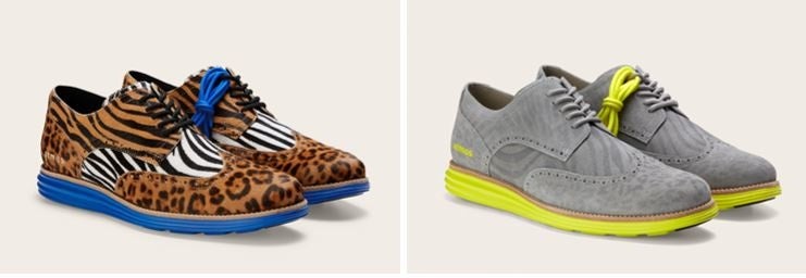 コレクションは2種類の配色からなります。1つは「Instinct」と名付けられたデザインで、atmosの世界観を打ち出した3種類のアニマルプリントレザーを使い、ブランドの代名詞とも言える目を引くブルーのミッドソールでアクセントをつけました。2つ目の「Logic」はCole Haanの伝統に沿った配色で、都会的なアイロンストーンとサルファースプリングを組み合わせ、アニマルプリントを型押しした(デボス加工)スエードと鮮やかなポップカラーのミッドソールでしたてています。