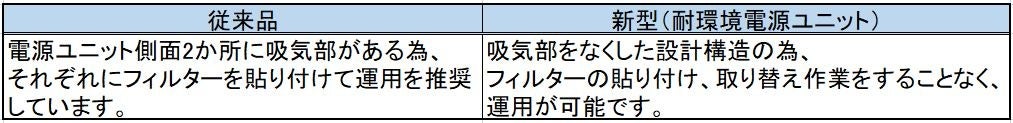 従来の電源ユニットには吸気部2か所があり外気を吸い込む構造でした。またフィルターの貼り付けおよび交換を必要とするため、お客様の交換作業やメンテナンス工数が発生していました。この度、密閉型構造の電源ユニットを実現したことにより、今後はフィルターの取付および交換作業の必要がありません。