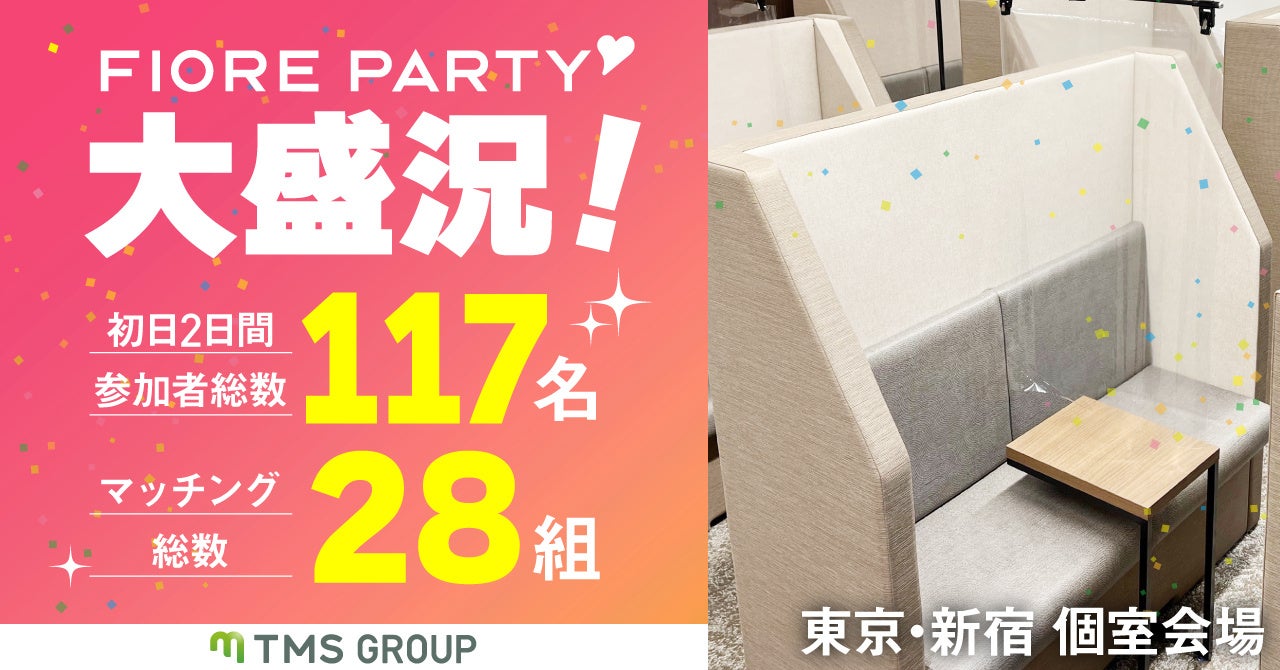 TMSグループが運営する婚活パーティーサービス「フィオーレパーティー(https://www.fiore-party.com/)」が、2022年9月3日(土)、『フィオーレパーティー東京・新宿個室会場』をオープン致しました。初日2日間の開催で総参加者117名、マッチング28組と、多くの方にご参加いただきました。