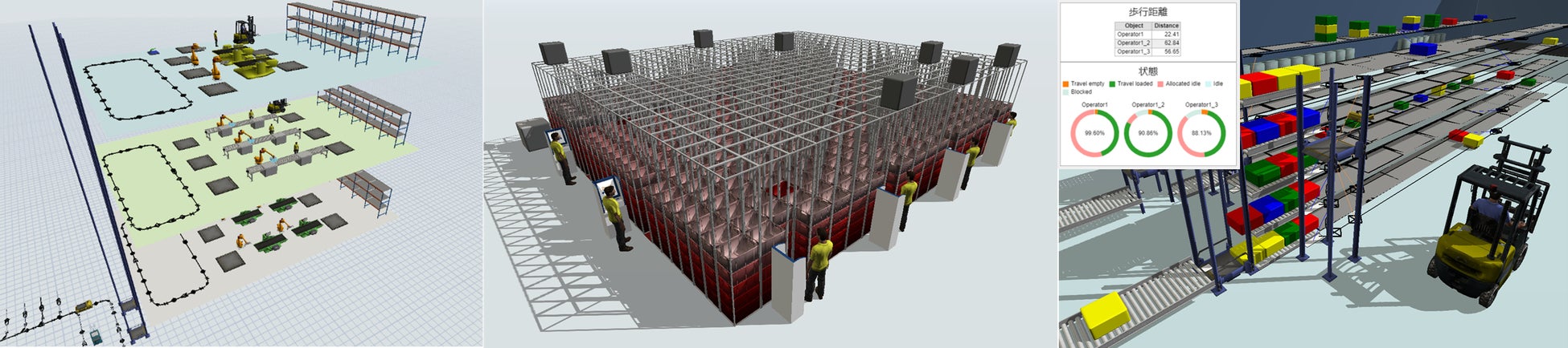 FlexSimは米国ユタ州のFlexSim Software Products, Inc.が開発する、離散事象解析の3Dシミュレーションソフトです。製造ラインや加工プロセス、物流倉庫、マテハンなどのシミュレーションモデルを、非常に軽量な3Dグラフィックを利用して構築し、「人・モノ」の流れを計算。機械や作業員の稼働率・作業負荷、作業時間など多岐にわたる情報を分かりやすい円グラフや折線グラフ(ダッシュボード)を使って一元的に表示します。稼働率や生産数が最大になる最適解をAIが算出する機能も備えています。これにより企業は自社、または顧客の工場や倉庫のボトルネックを発見し、性能を最大化するために必要な比較データを瞬時に得ることができます。