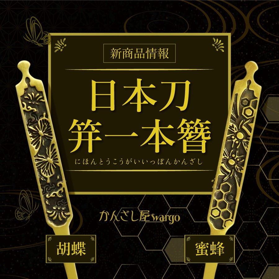 かんざし屋wargoより、『日本刀笄一本簪』の新コレクションを発表いたします。日本刀の装具である笄(こうがい)を一本簪に仕立てた『日本刀笄一本簪』は、幸福を運ぶシンボルの蜜蜂や優雅に羽ばたく美しい蝶の装飾を特徴としています。日本刀での笄は髪を撫でつけるための箸状のアクセサリーで、真鍮軸を使用した丈夫で扱いやすいデザインです。髪の多い方でも1本で簡単にまとめられ、季節を問わず併せやすい簪となっています。