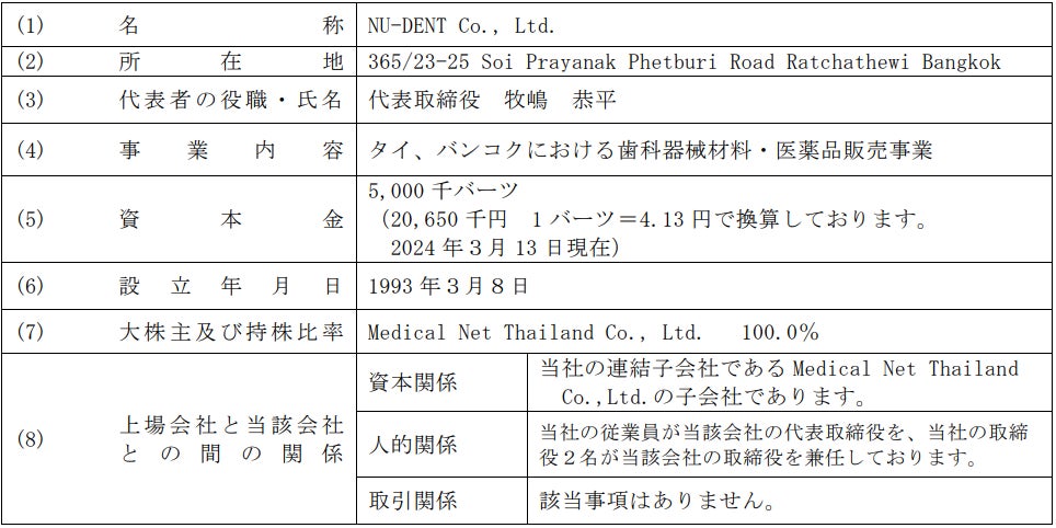 NU-DENT社は、タイ、バンコクで歯科商社事業を行っており、2022年3月に当社の連結子会社Medical Net Thailand Co., Ltd.が発行済株式の100%を取得し、連結子会社(孫会社)となってから、当社グループの歯科におけるタイでの事業領域を拡大しております。