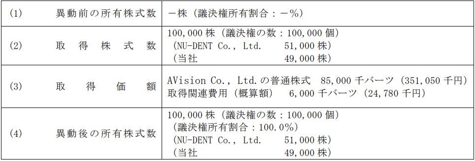当社は、2024年3月14日開催の取締役会において、以下のとおり、AVision Co., Ltd.(以下、「AVision社」)の発行済株式の株式の49%を当社が、51%を当社の連結子会社(孫会社)であるNU-DENT Co., Ltd.(以下、「NU-DENT社」)が取得することを決議いたしました。なお、本件によりAVision社は連結子会社となることをお知らせいたします。