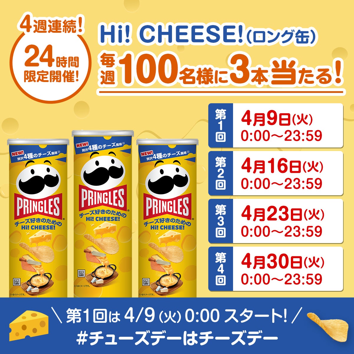 4月の毎週火曜日にXフォロー&リポストの『#チューズデーはチーズデー』キャンペーンを実施いたします。フォロー&リポストで、「プリングルズ Hi! CHEESE!」の ロング缶×3本が各回100名様に当たるキャンペーンです。