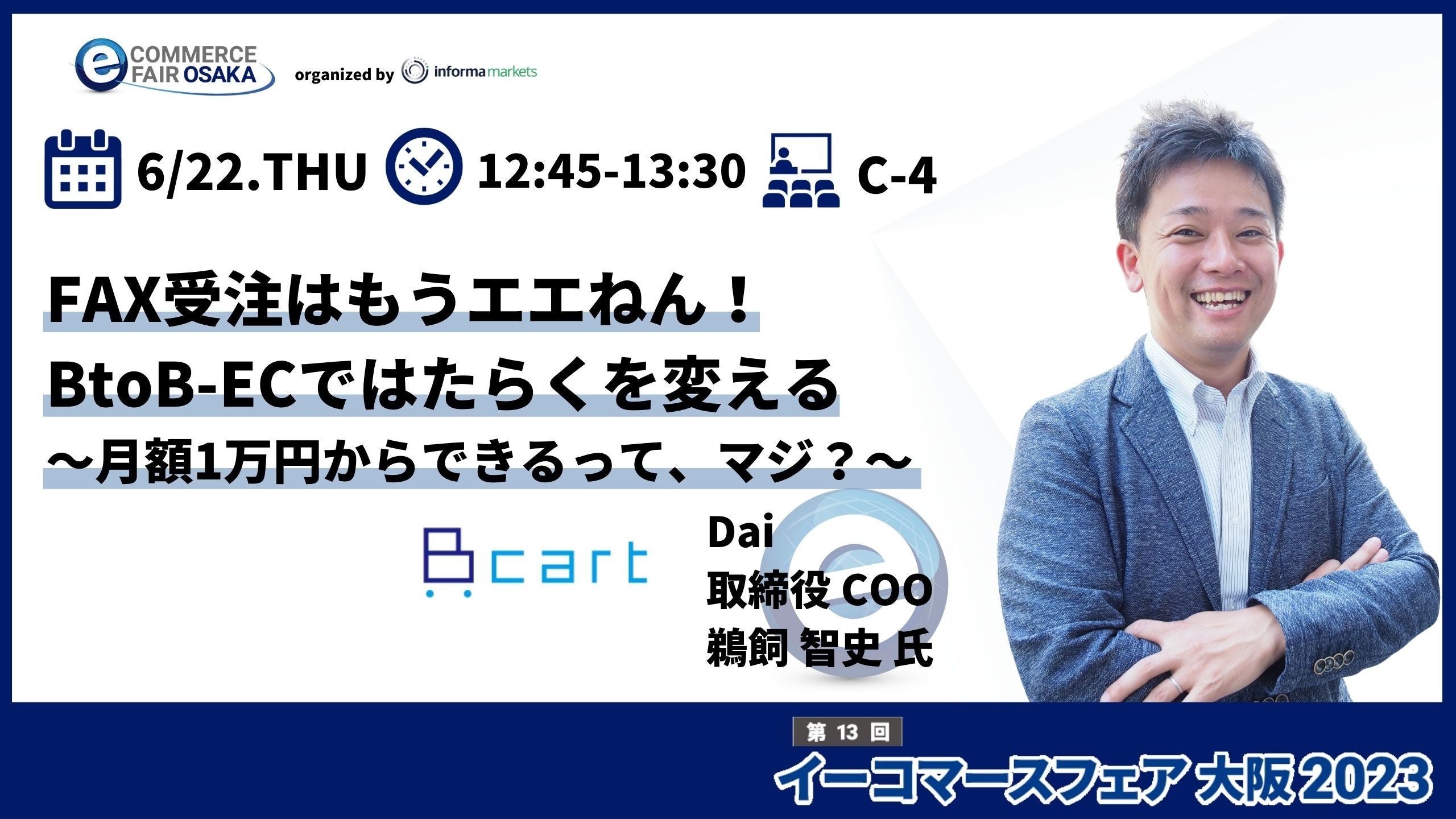 導入企業1500社超・運営実績No.1(※)の「Bカート」を提供する株式会社Dai (ダイ) (京都市中京区、代表取締役:木脇和政)は、2023年6月22日(木)・6月23日(金)に開催される「イーコマースフェア大阪2023」(以下、イーコマースフェア)に出展いたします。また、6月22日(木)のBtoB-ECセミナーに登壇いたします。