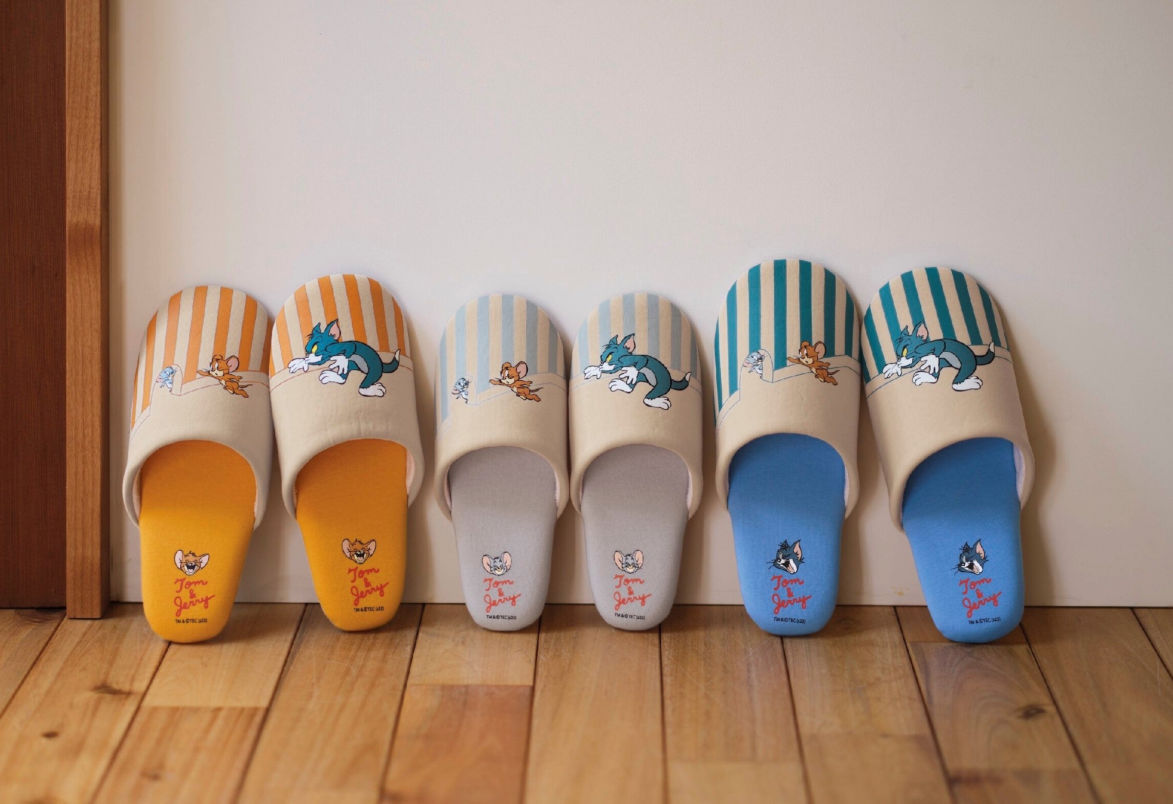 メンズ・レディースサイズのパジャマは、ネコのトムとネズミのジェリーが追いかけっこを繰り広げているシーン、キッズサイズのプリントは追いかけっこして眠たくなったジェリーがデザインされています。家族みんなでつながったストーリーがあるようなデザインがポイントです。また、家族お揃いで履けるスリッパにも、二人の追いかけっこが繰り広げられています。壁紙デザインのストライプ柄、サイズに合わせてかかと部分はトムとジェリー、そして小さく可愛らしい、ネズミのタフィーがにっこり笑っているデザインでファンの方にも楽しんでいただける商品となっております。