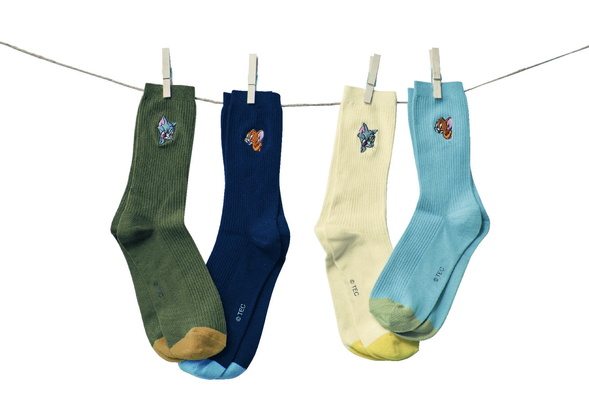 伸縮性の高いリブ編み。ひょっこりのぞいたトムとジェリーの刺繍が可愛く、配色がおしゃれな靴下。
