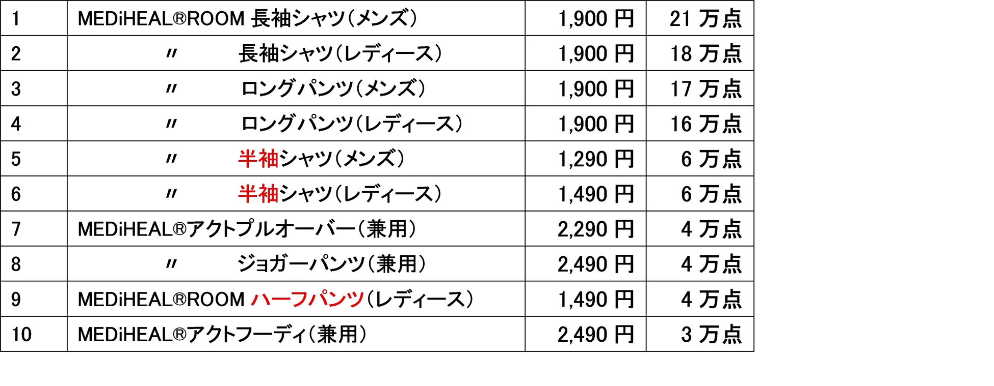 現在販売上位の店舗では一時的にサイズ・色欠品が生じているケースもありますが今後毎月150万点規模で入荷してまいります。特に人気があるのは男性用の「MEDIHEAL®ROOM」長袖シャツとロングパンツ各税込1900円と女性用の「MEDIHEAL®ROOM」長袖シャツ、ロングパンツ各税込1900円です。在庫は順次入荷しますが早めのお買い求めをおすすめしています。