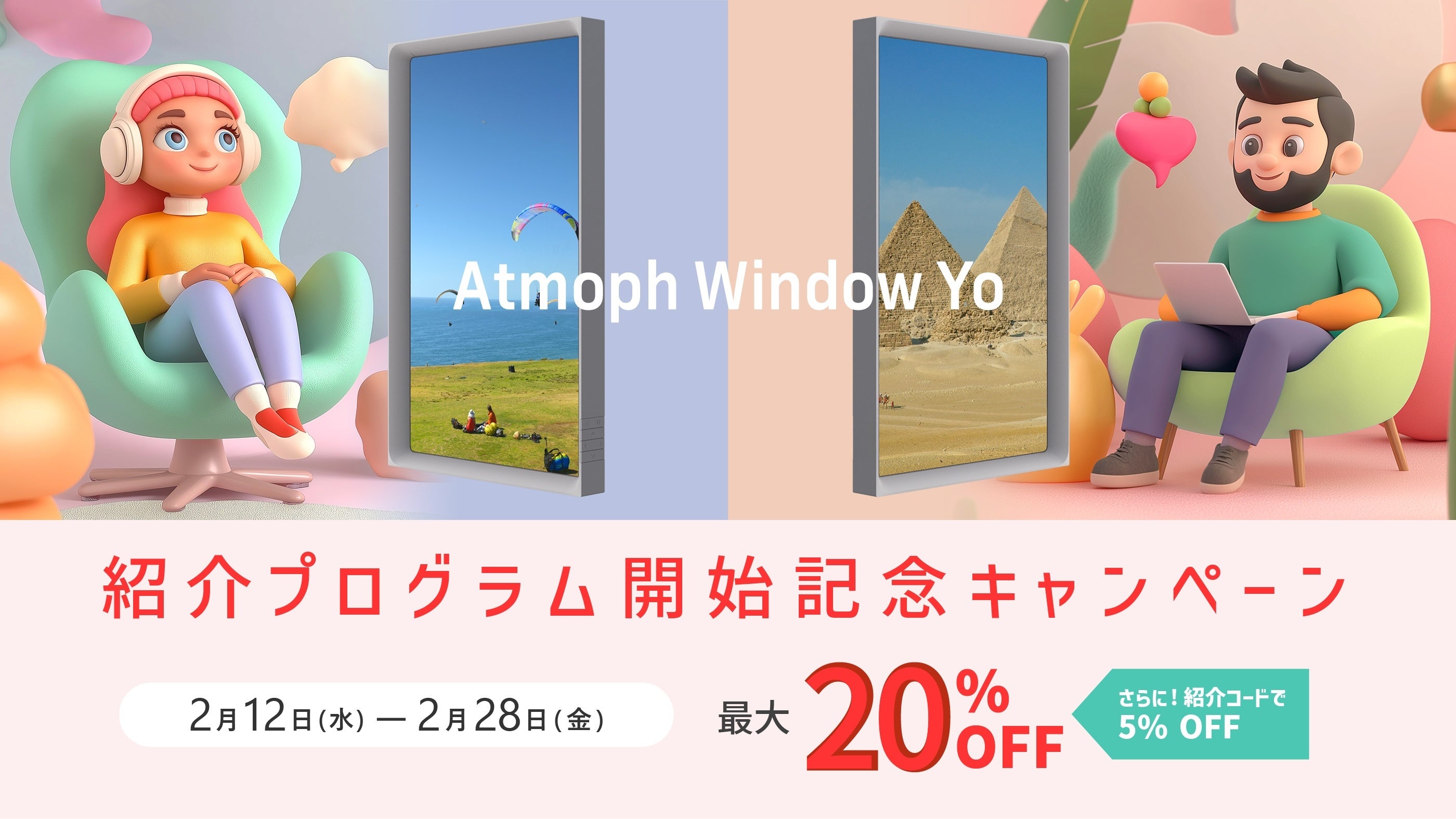 Atmophは、バーチャル窓「Atmoph Window」のある暮らしをより多くの人に体験していただくため、新たに友達紹介プログラムをスタートしました。このプログラムでは、Atmoph Window Yoを紹介することで、双方に特典が提供されます。