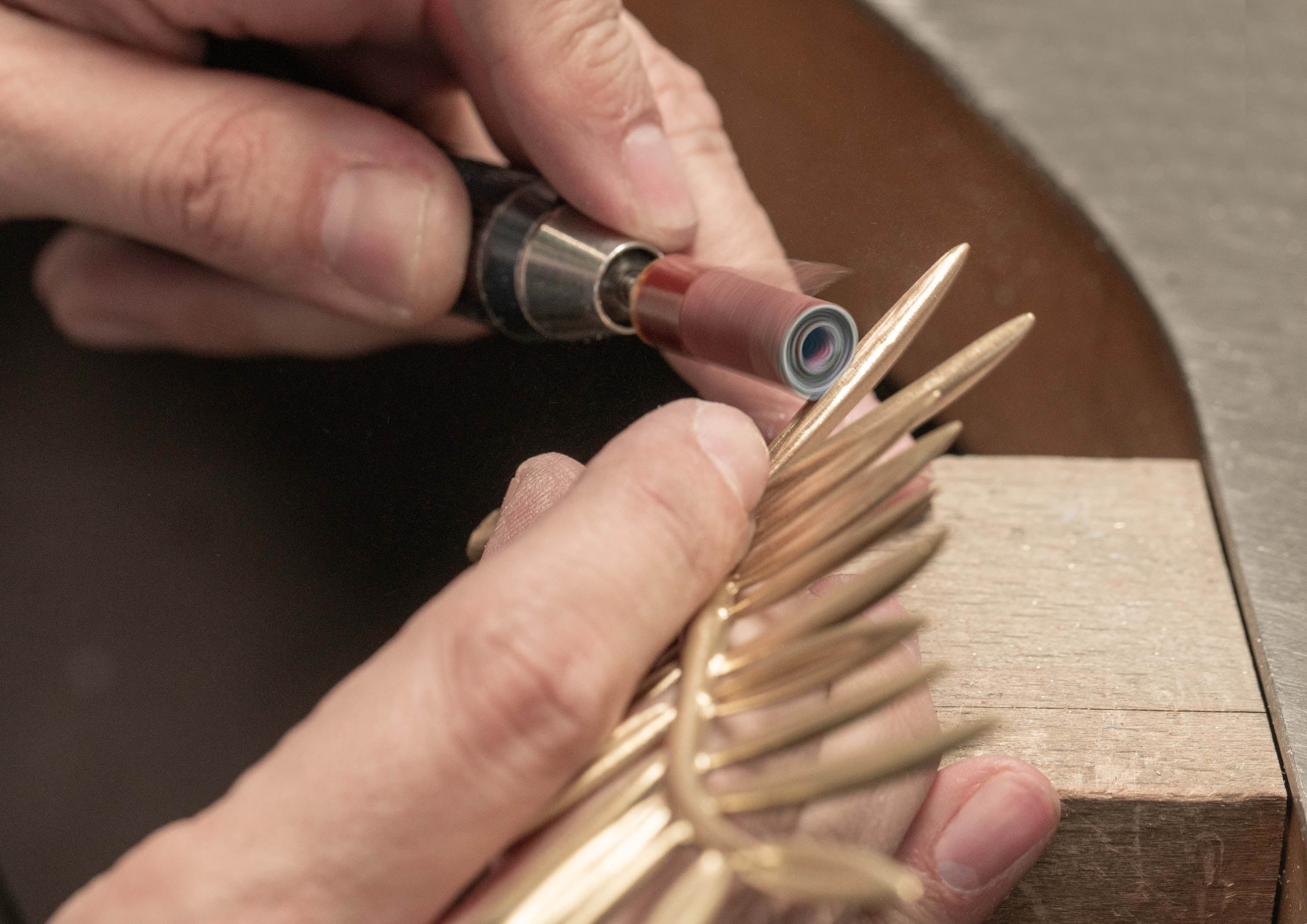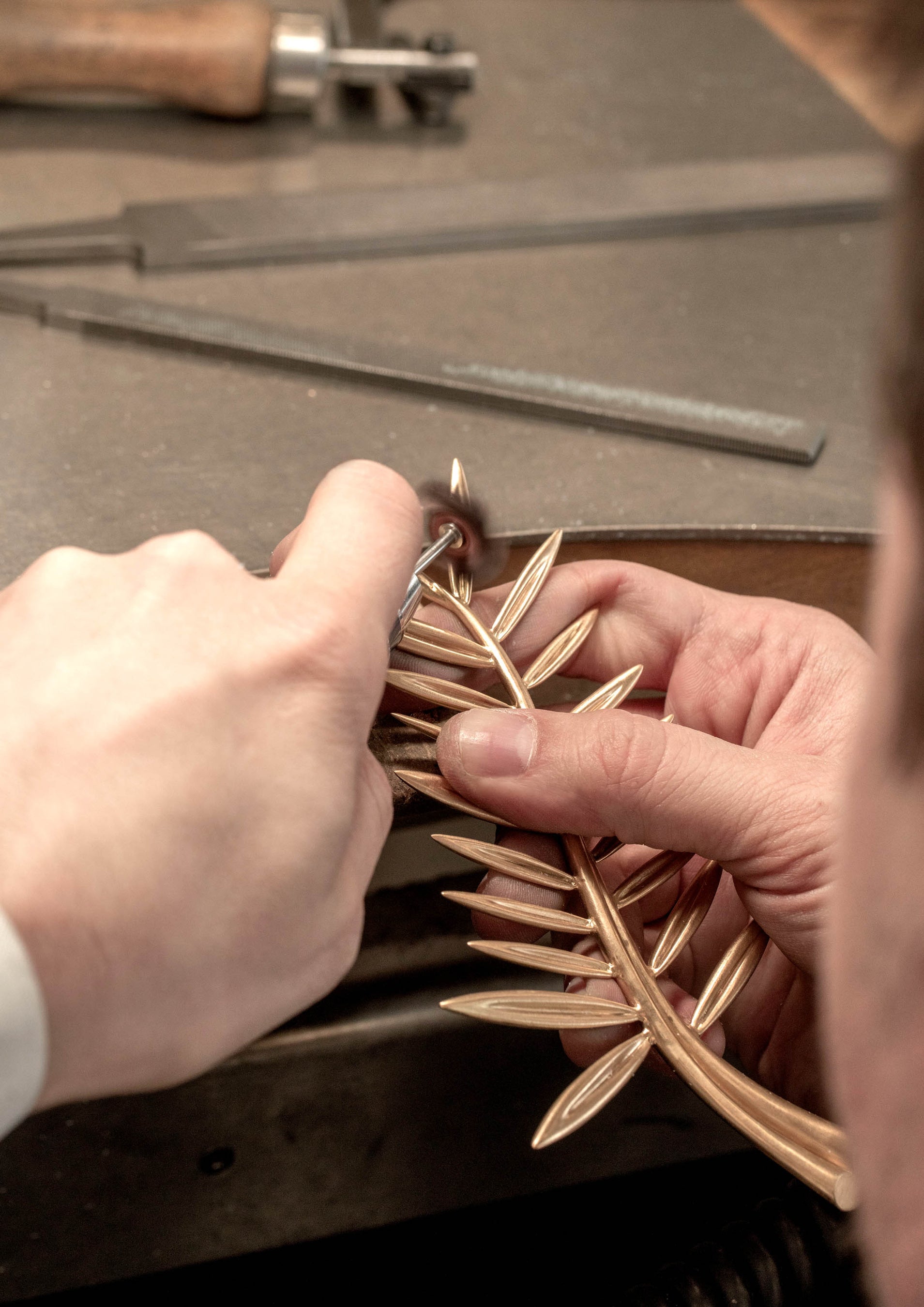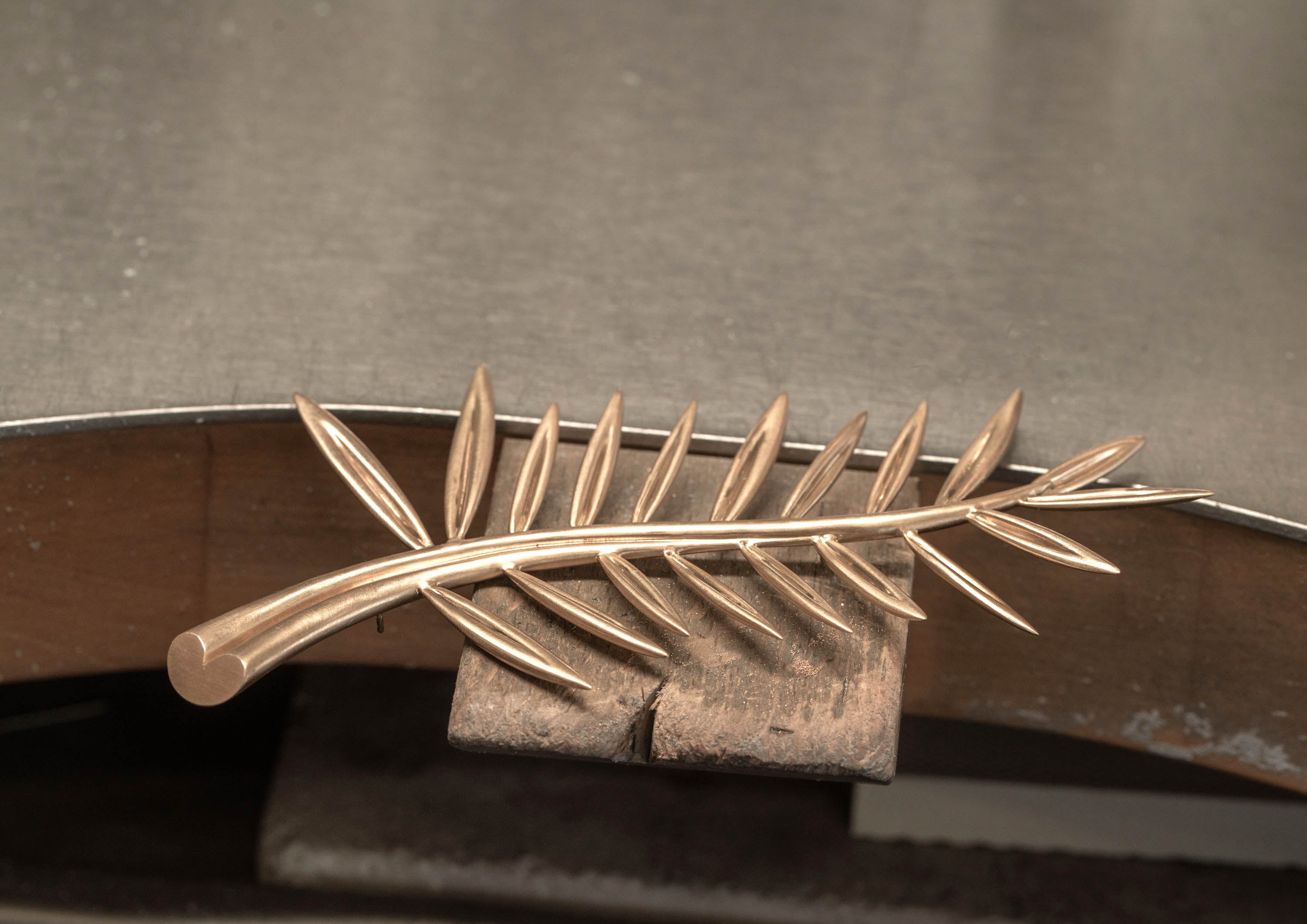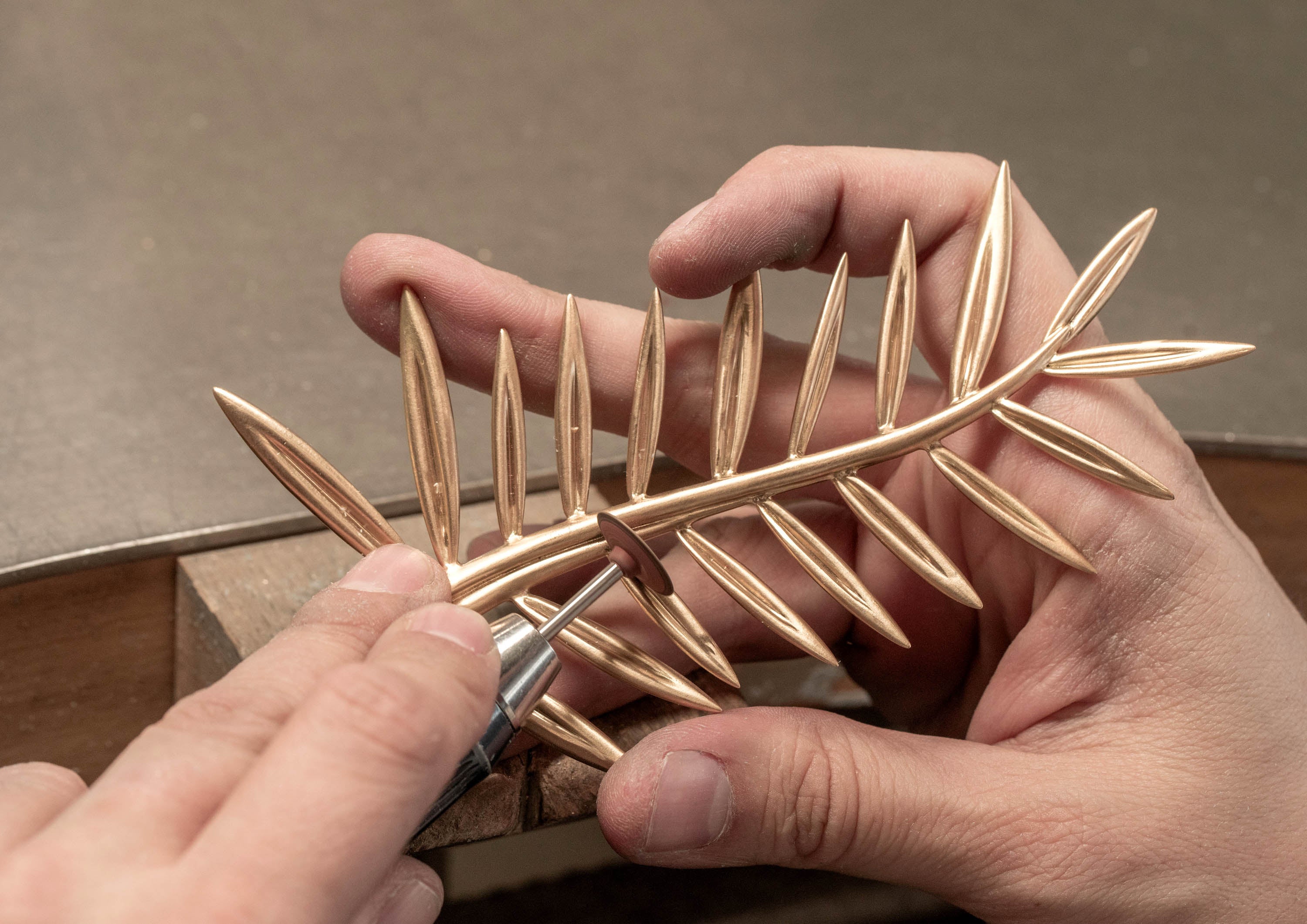 パルム・ドールの製作には、70時間以上もの緻密な作業が必要とされます。2014年以来、ショパールの取り組みである「サステナブル・ラグジュアリーへの旅」プログラムの一環として、トロフィーのゴールドにはエシカルゴールドが使用されています。最高水準の社会的・環境的基準に基づいて採掘された118グラムのゴールドは、6人の熟練職人の手によって加工されます。製造には、「ロストワックス」鋳造法による鋳型の製作、900℃の高温でのゴールドの溶解作業など、数多くの工程が含まれ、そのすべてがショパールの工房で行われています。