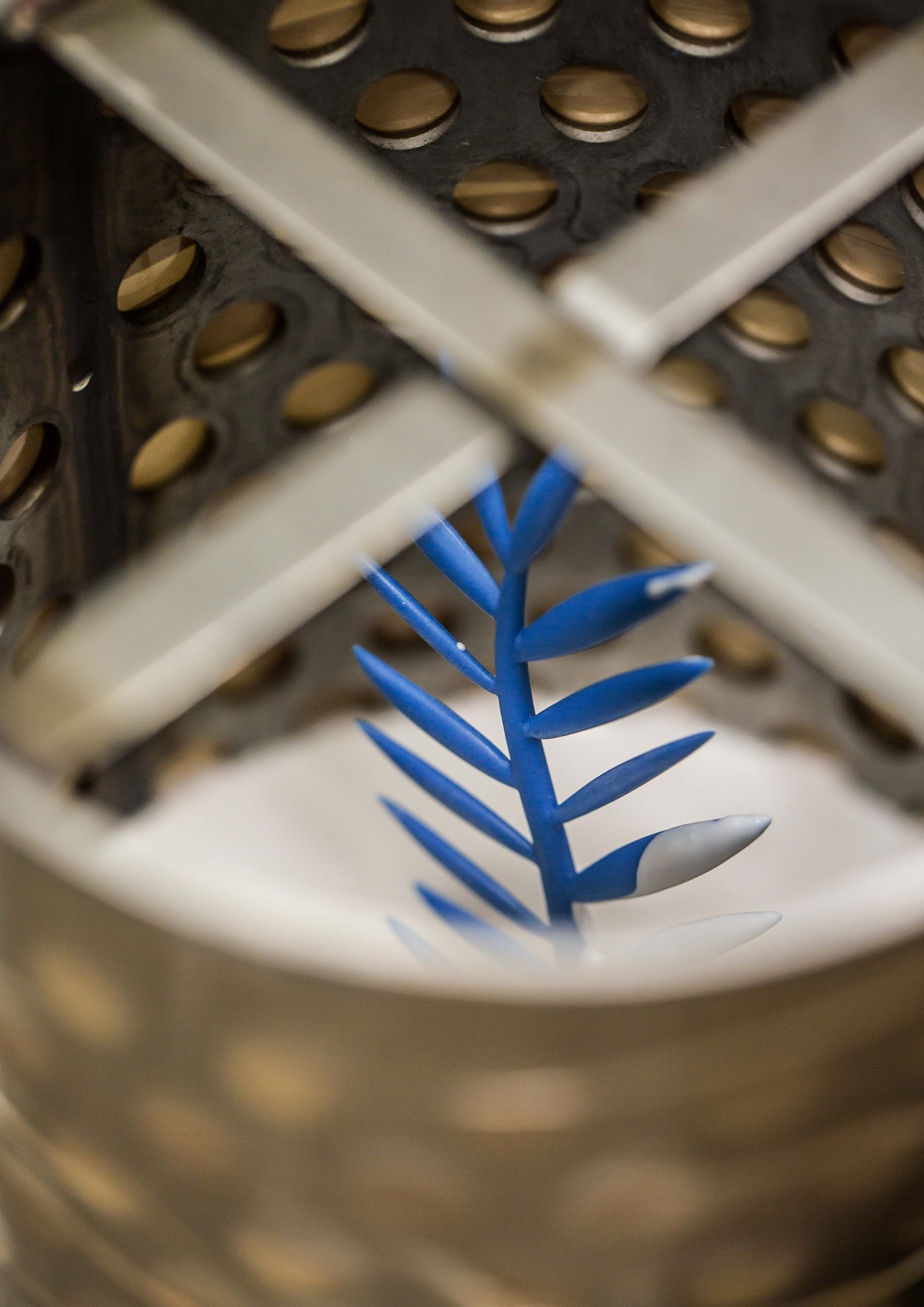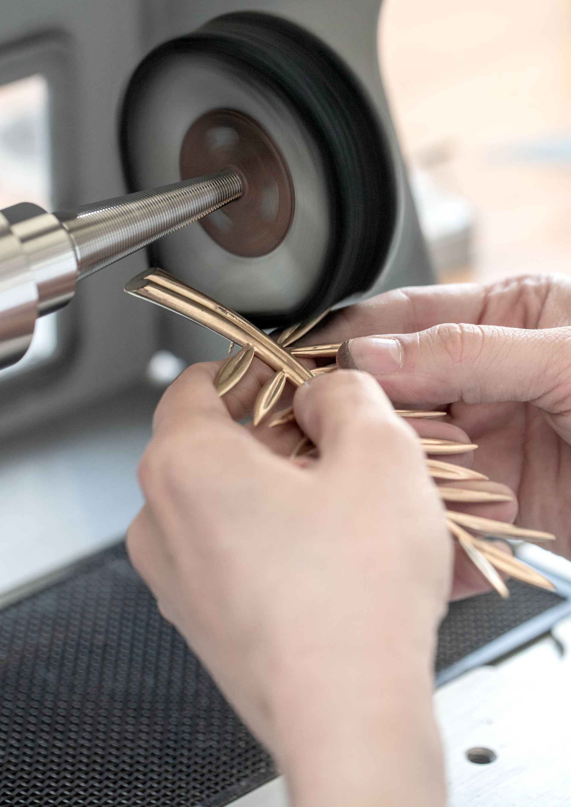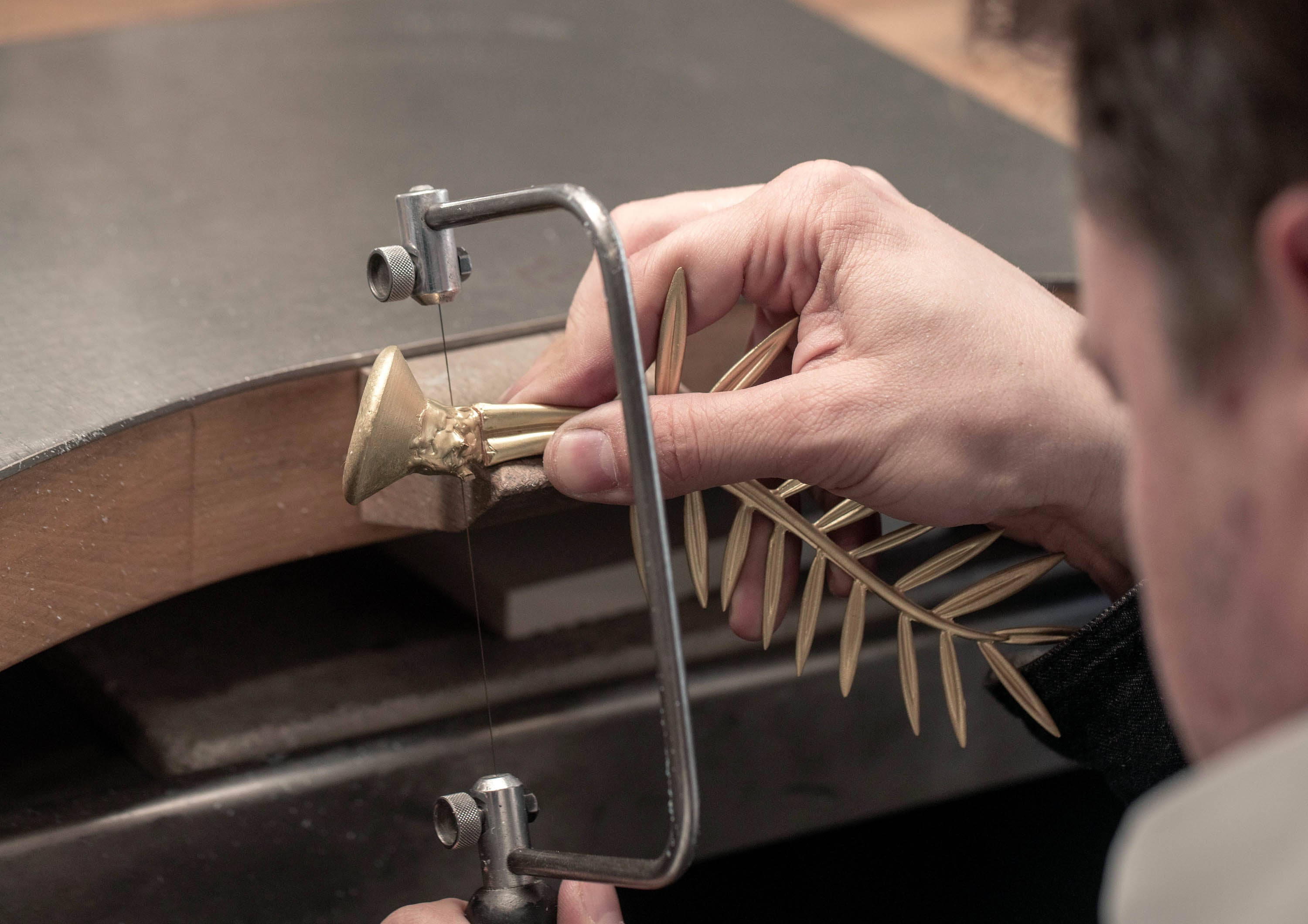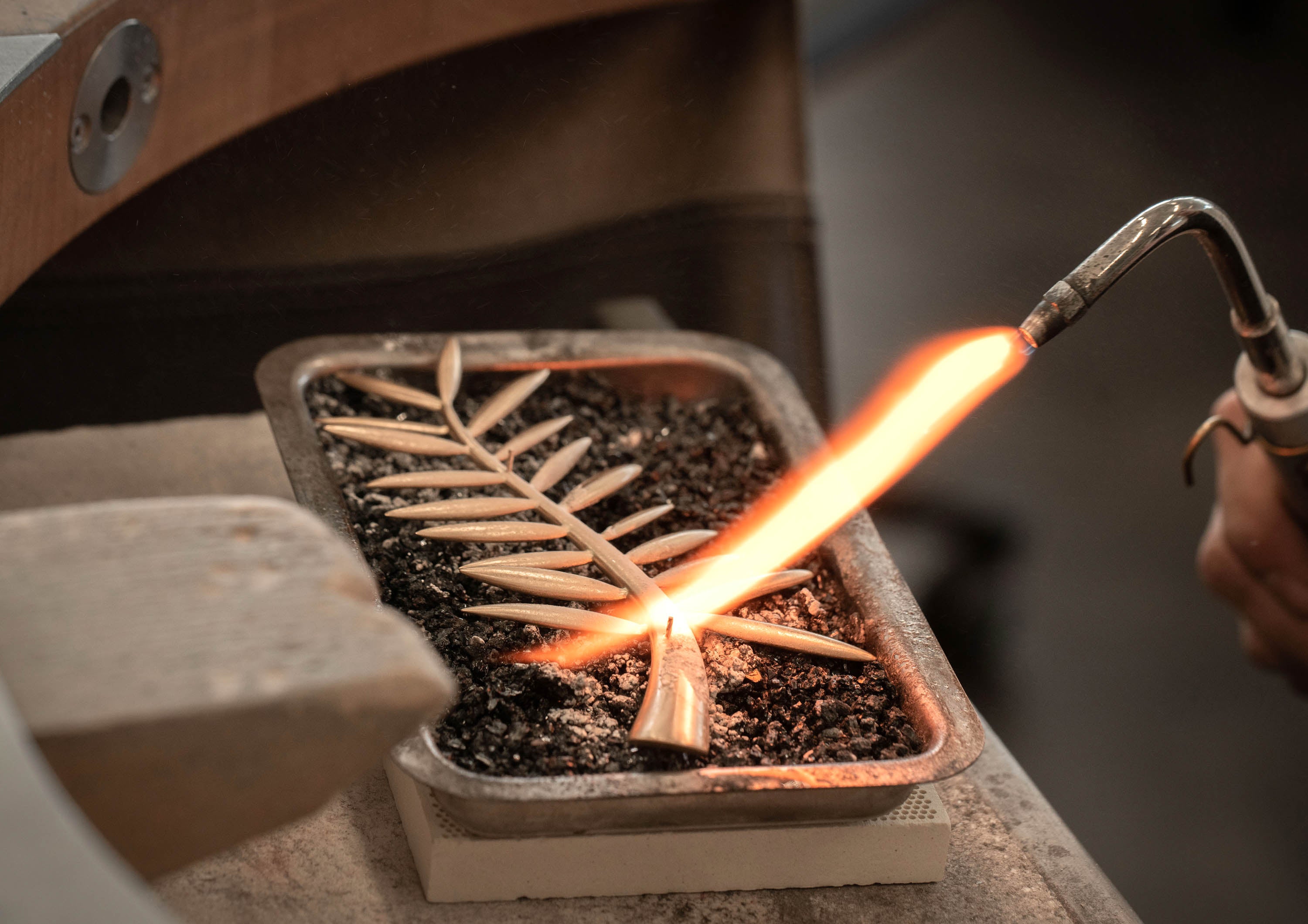 パルム・ドールの製作には、70時間以上もの緻密な作業が必要とされます。2014年以来、ショパールの取り組みである「サステナブル・ラグジュアリーへの旅」プログラムの一環として、トロフィーのゴールドにはエシカルゴールドが使用されています。最高水準の社会的・環境的基準に基づいて採掘された118グラムのゴールドは、6人の熟練職人の手によって加工されます。製造には、「ロストワックス」鋳造法による鋳型の製作、900℃の高温でのゴールドの溶解作業など、数多くの工程が含まれ、そのすべてがショパールの工房で行われています。