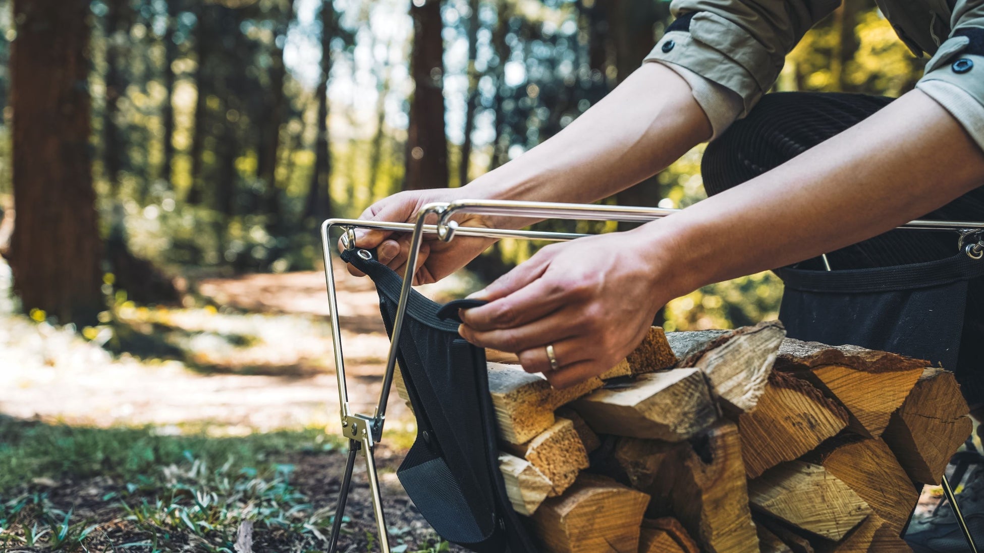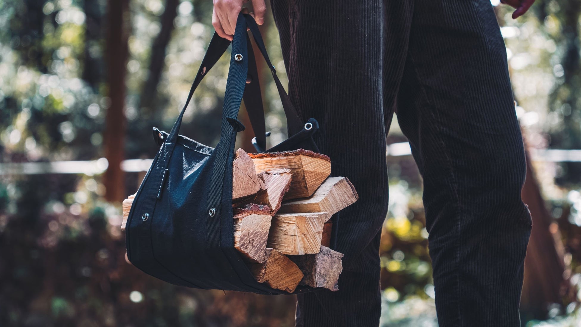 単体で使う際は、重い薪を運ぶ負担を軽減できるよう肩掛けも可能なハンドルの長さになっています。また、高密度で厚く、火の粉が飛んでも燃え広がりにくい帆布素材を採用。負荷のかかる箇所は補強を施しています。