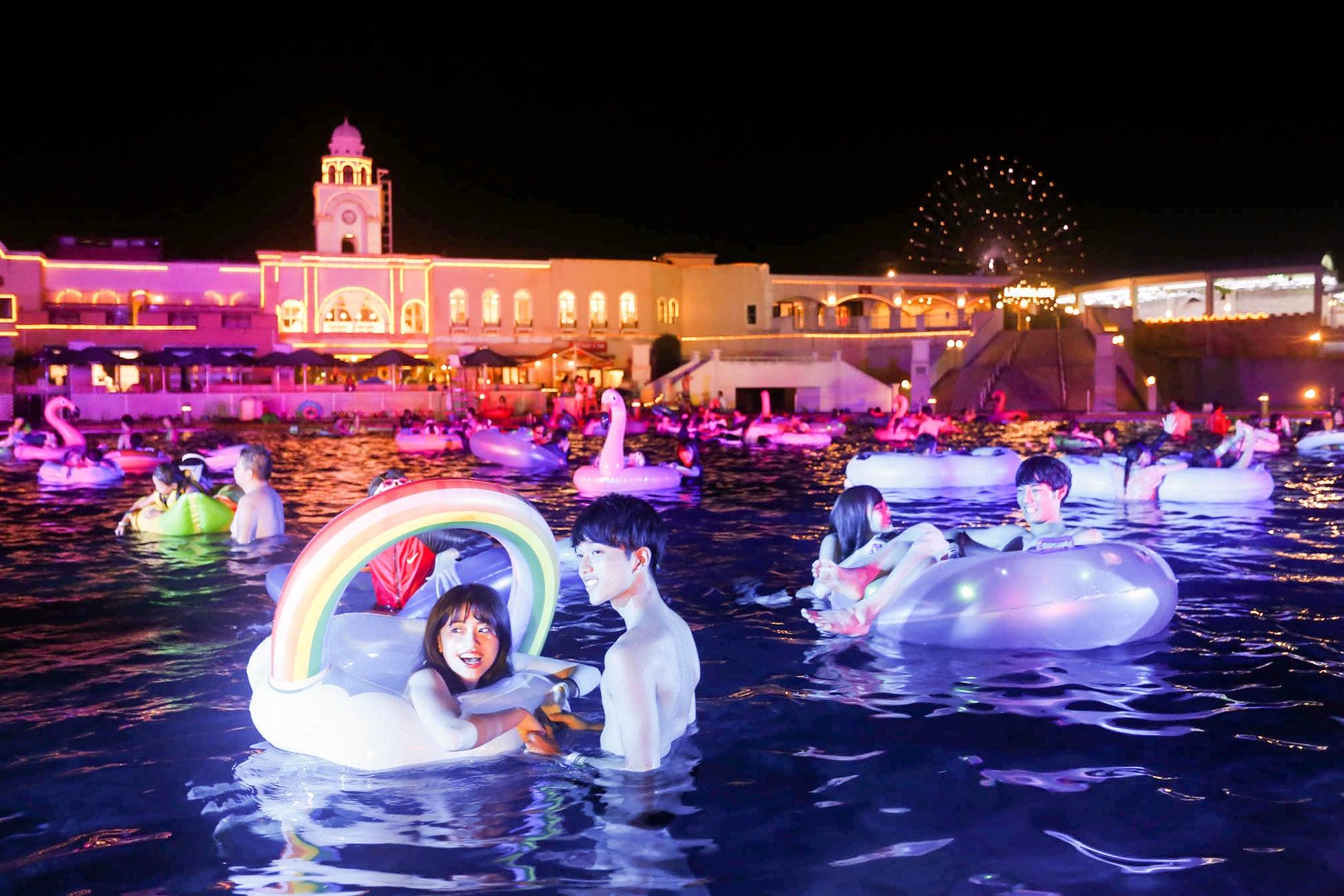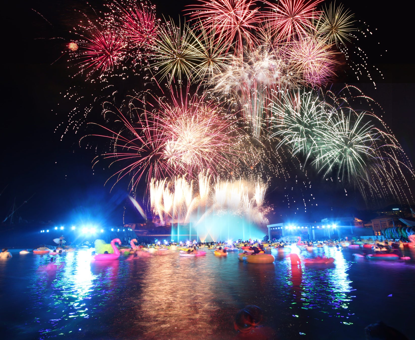 ナイトプールに入りながら楽しめる花火ショーです。夜空を彩る壮大な花火、テクノとロックが融合したサウンド、そして照明・噴水・レーザーのショーエフェクトのコラボレーションをお楽しみいただけます。