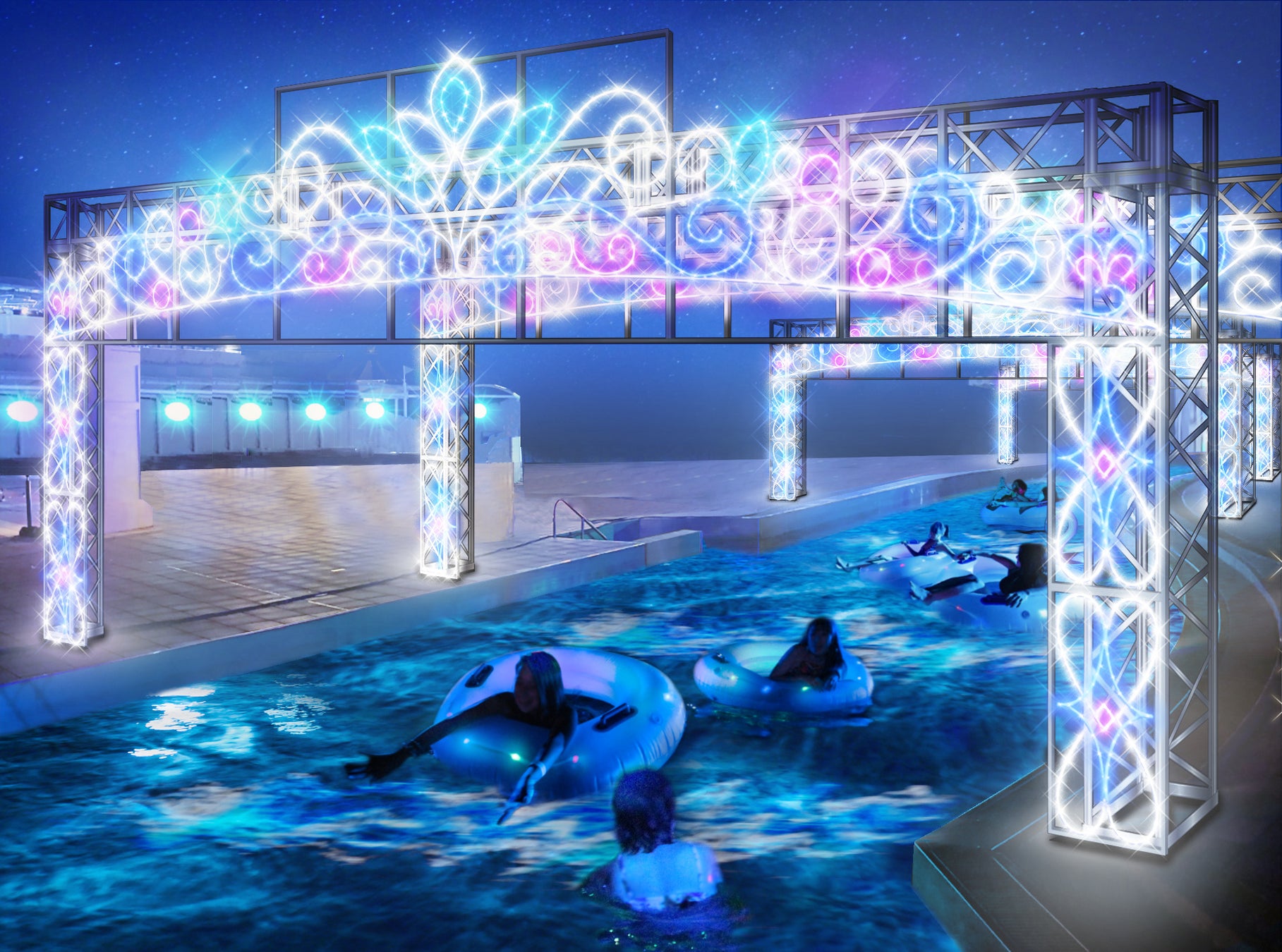 ナイトプールがバージョンアップし、今年は流れるプール「ウロボロスの河」でも遊べます。プールには光のアーチが設置され、イルミネーションを見ながらナイトプールを満喫できます。