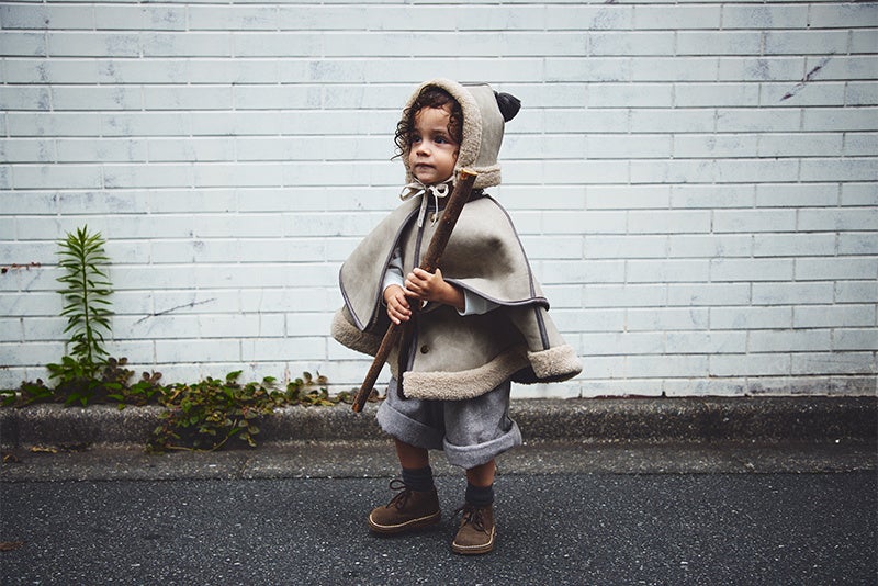 大人気の帽子付きケープアウターに、今年の限定素材が登場。肉厚のフェイクムートンで、凍える外気から子ども達を守ります。