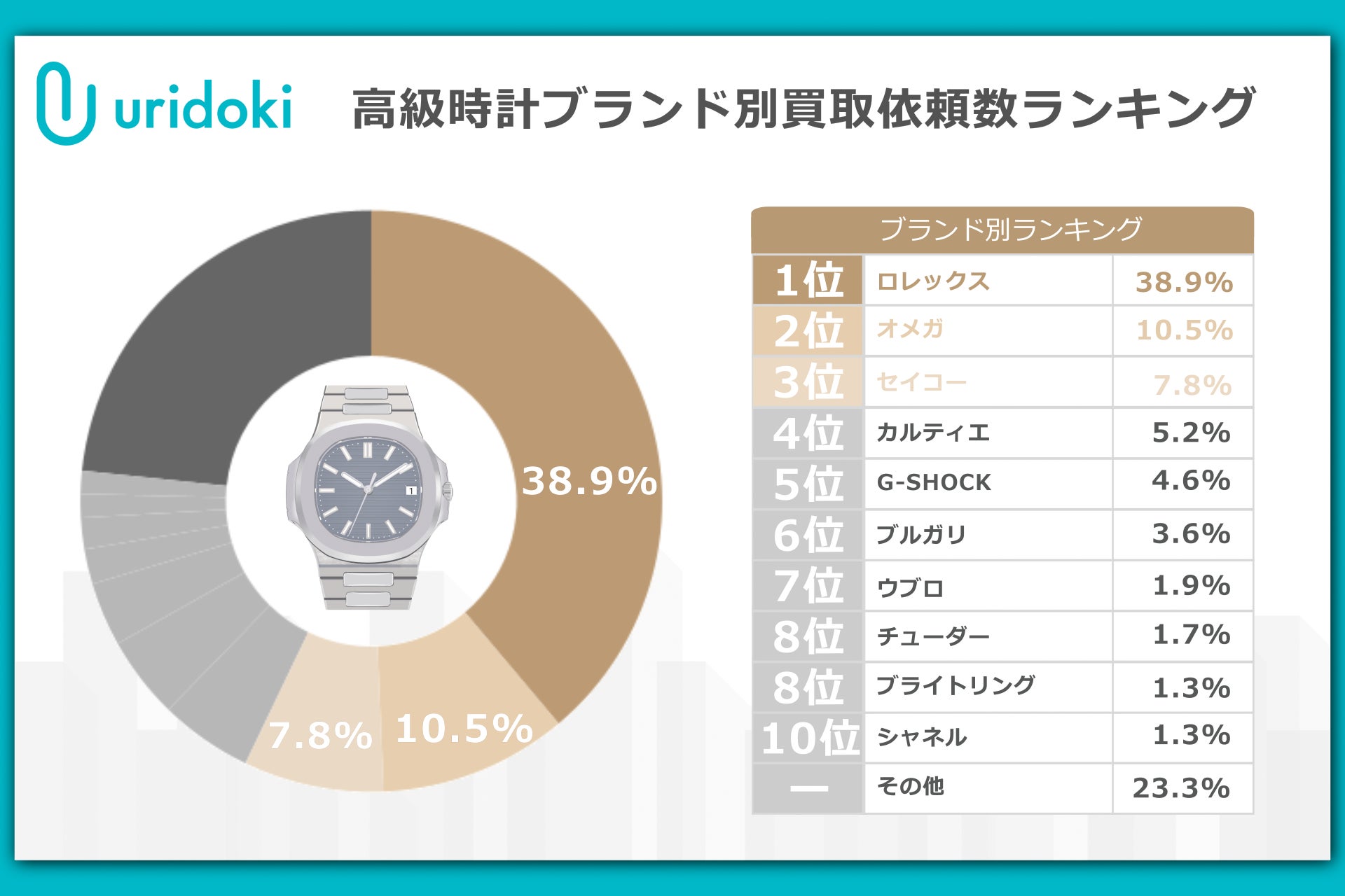 時計カテゴリにおいて、最も多くの買取依頼を受けたブランドは「ロレックス」で、シェアは38.9%を占めました。しかしながら、2024年7月時点のシェアは54.7%から大きく減少し、15.6ポイントのシェアダウンとなっています。