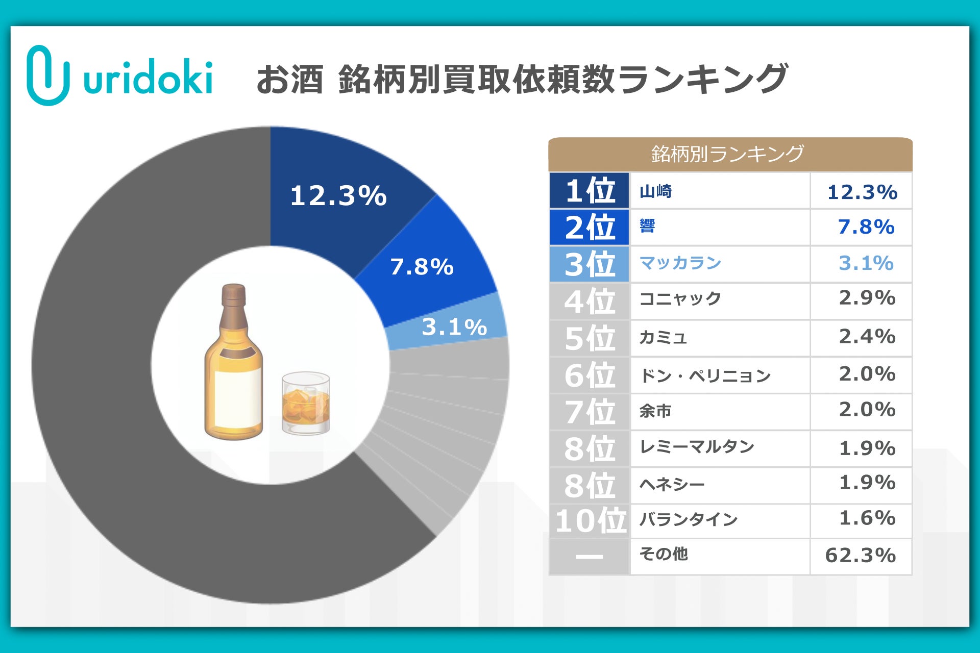 お酒カテゴリにおいて、買取依頼が最も多かった銘柄は「サントリー山崎」で、前回の24.2%から11.9ポイント減少したものの、12.3%のシェアとなりました。