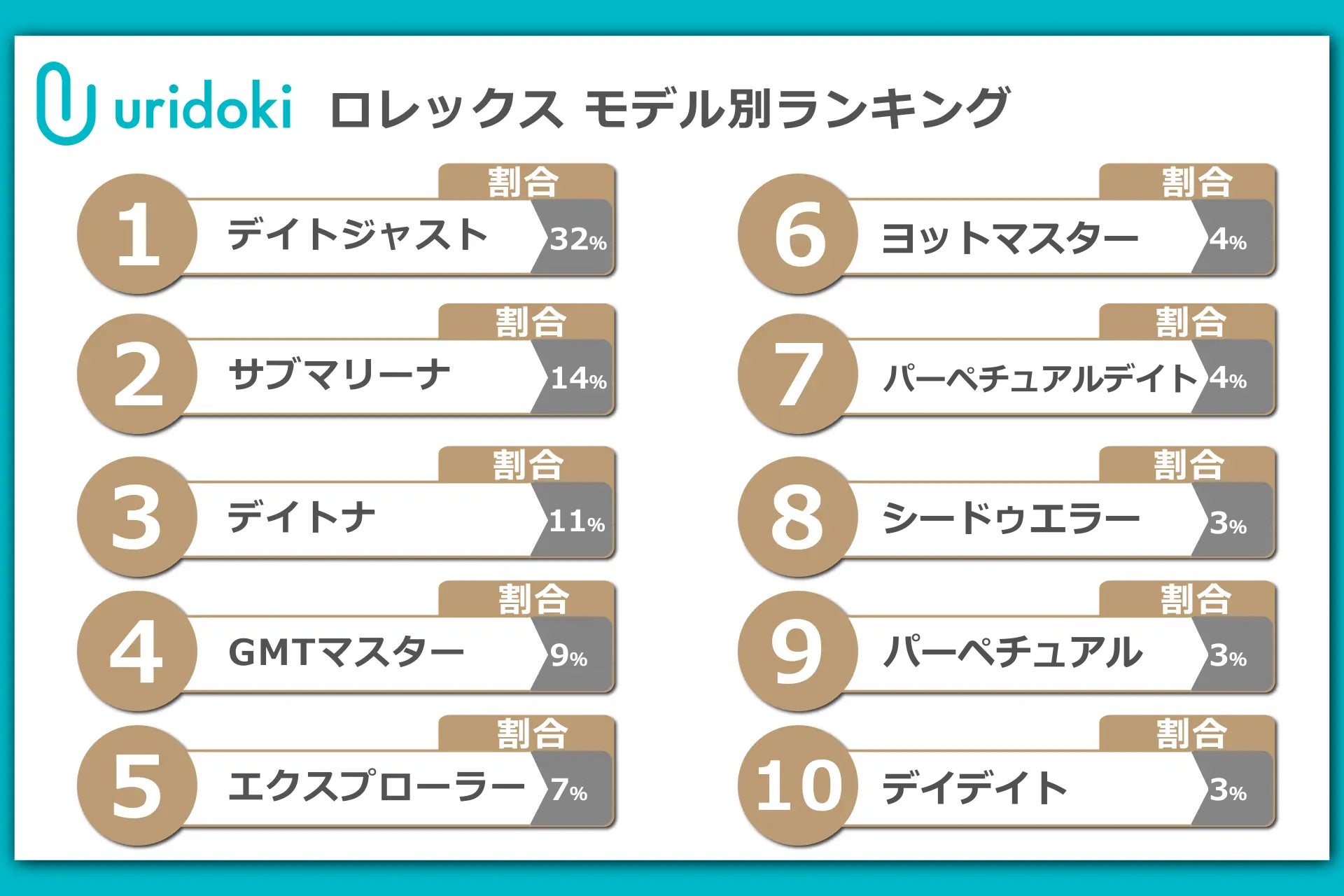 「ロレックス」の中では、「デイトジャスト」が最も多くの査定依頼を集め、全体の32%を占めました。