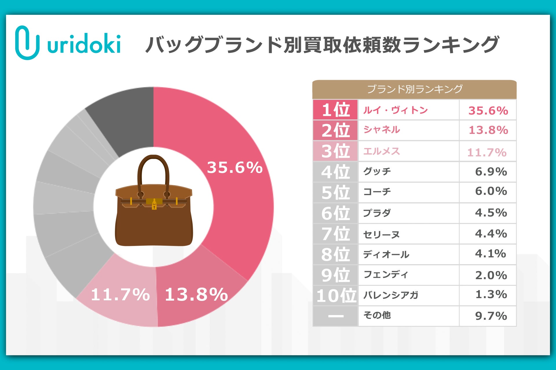 ブランドバッグカテゴリにおいて、最も多くの買取依頼を集めたのは「ルイ・ヴィトン」で、シェアは35.6%となりました。