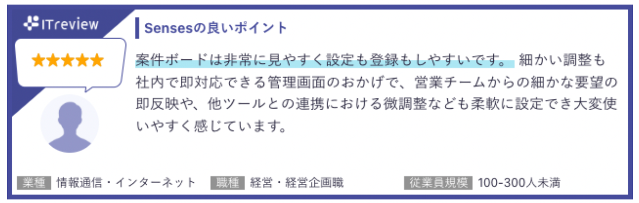 ITreviewにて、Sensesを実際に利用いただいているお客様よりたくさんのお声をいただいております。