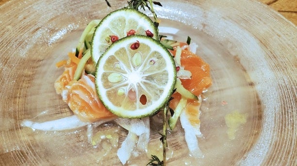 ・ビアベースベアレン盛岡駅前/宮古サーモンの大分カボスマリネ カボスラードラーのソース (¥880)