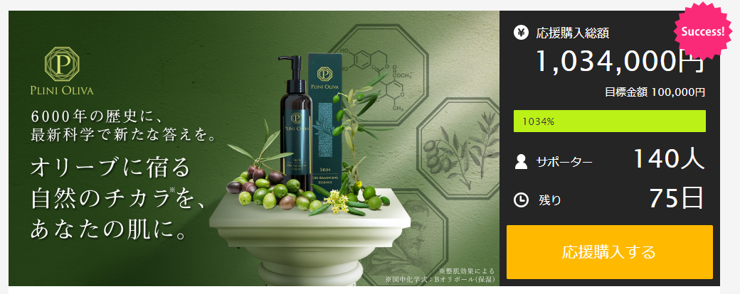 【開始25分で目標金額達成!】新商品「PLINI OLIVA(プリニオリーバ)」先行応援購入。さらに プロジェクト2日で100万円突破!