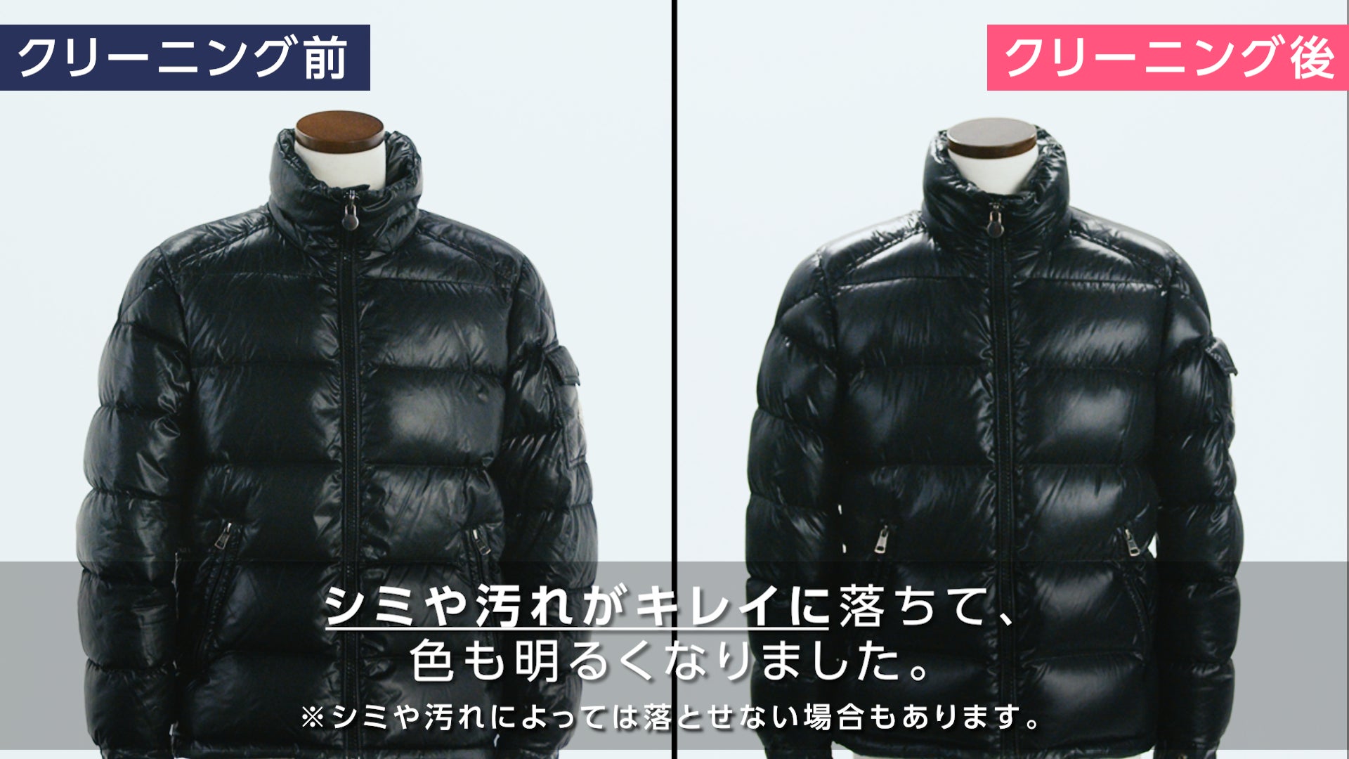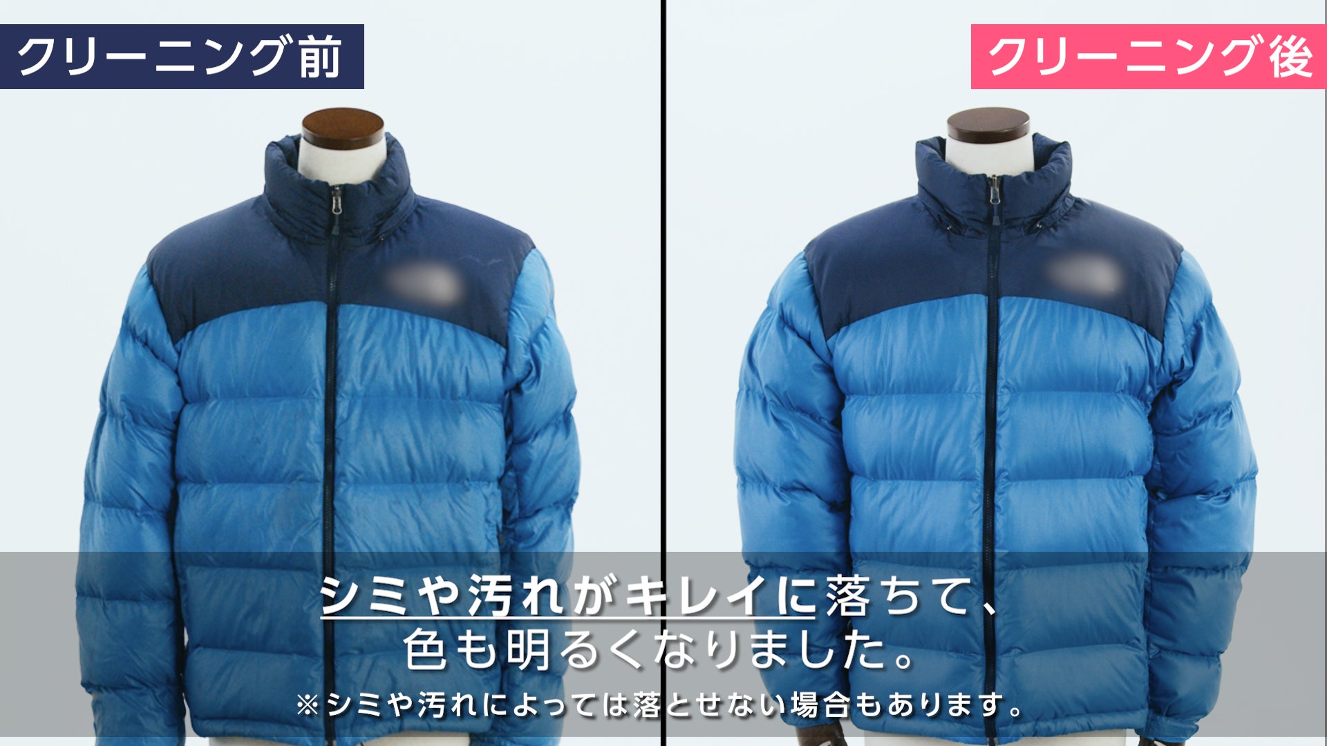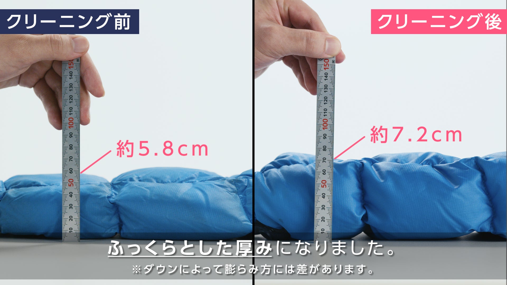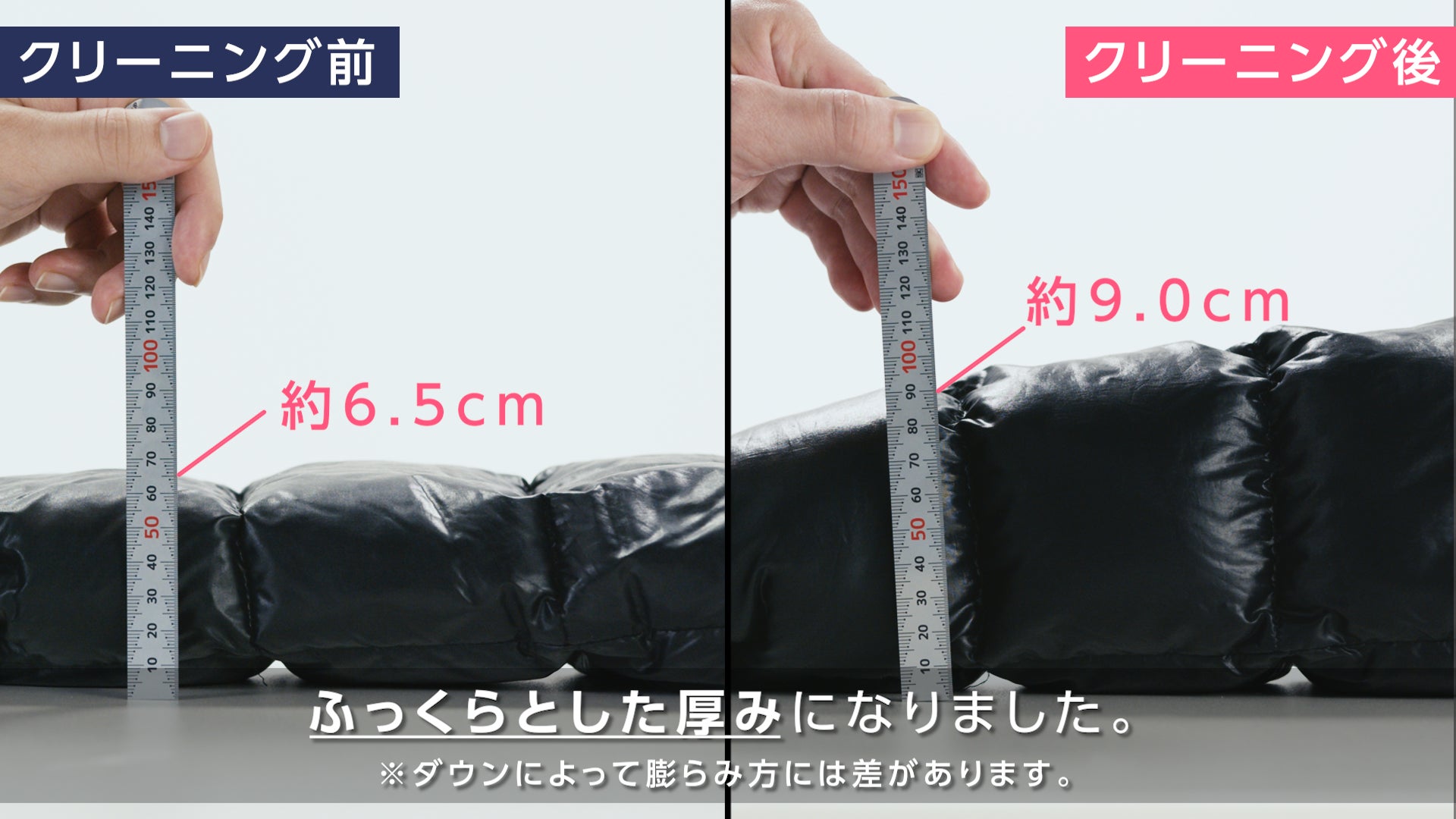 長年放置されたダウンはクリーニングによってどのような変化があるのか、実際にクリーニングをして検証した動画を公開します。制作にはクリーニング歴20年以上の、リネットお洗濯アドバイザー・クリーニング師の近藤高史が監修を行い、黒色のダウン、青色のダウン2種類のダウンを、クリーニングをする前と後で見た目や厚みがどれほど変化があるのかを検証しました。クリーニング実施後は、シミや汚れが綺麗に落ち色鮮やかな見た目となり、袖口付近も約2cmの厚みの復活が見られ、全体もよりふっくらとしたダウンとなりました。