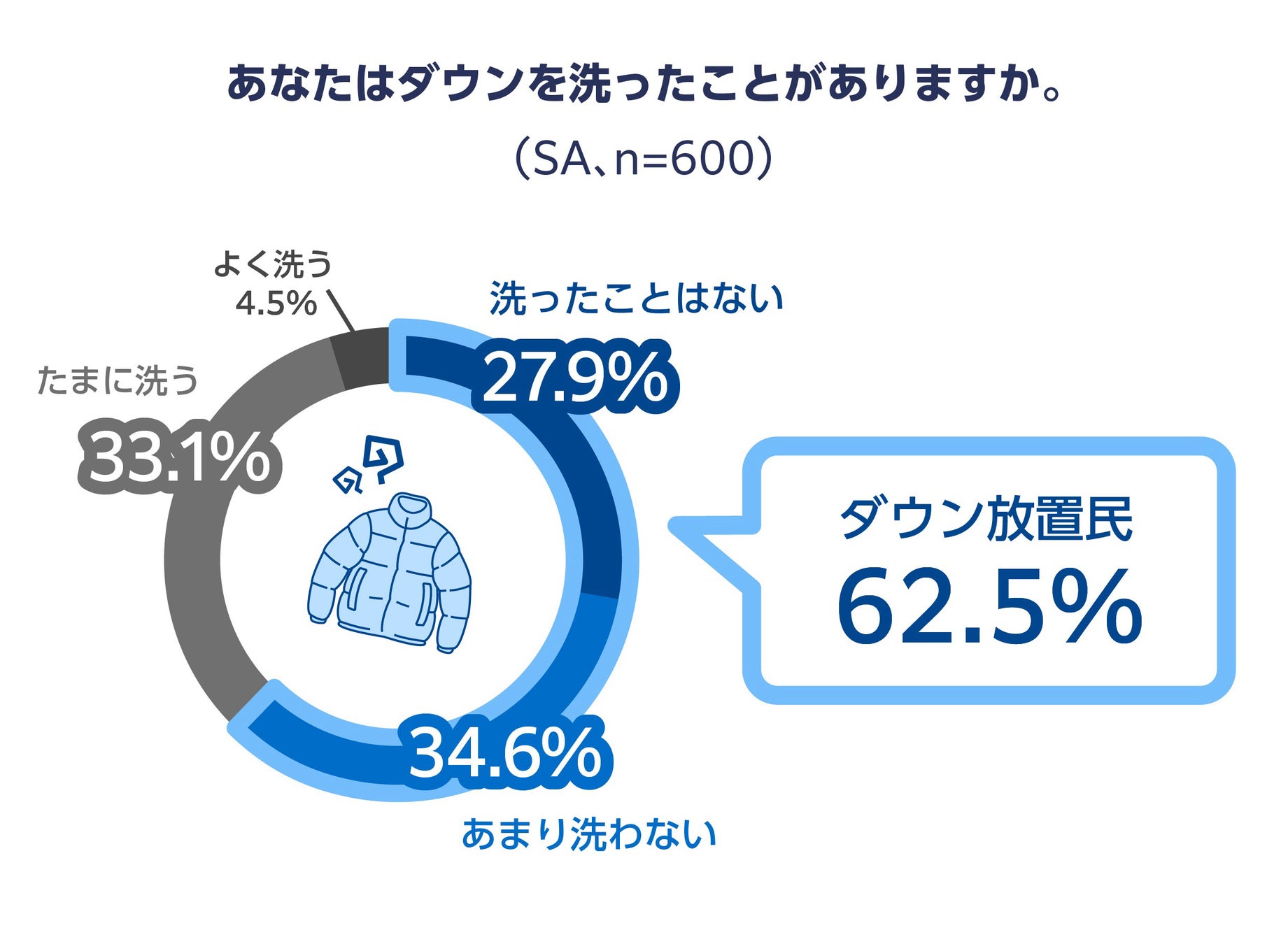 20代から30代男女の半数以上(55.8%)が、冬は週に5日以上ダウンを着用するも、27.9%が過去にダウンを「洗ったことがない」、34.6%がダウンを「あまり洗わない」と回答。合わせて6割以上(62.5%)がダウンを習慣的に洗わない、「ダウン放置民」であることが判明しました。