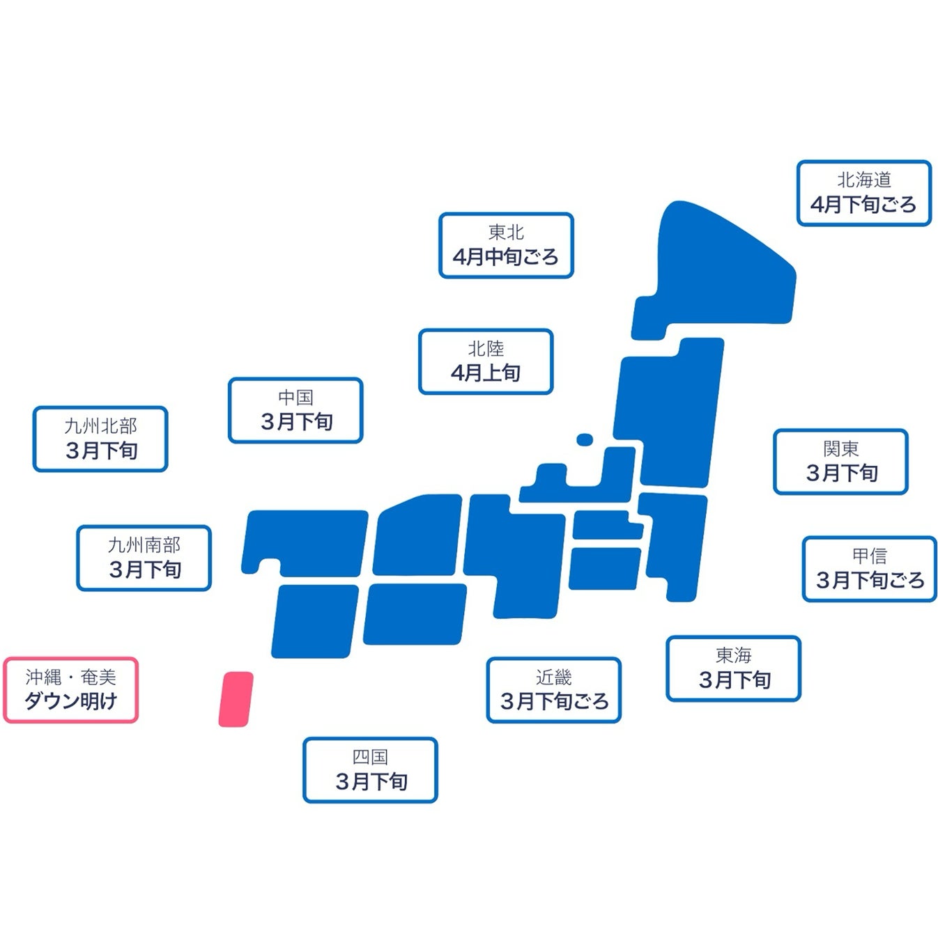 今年は桜の季節の到来とともに、ダウン明けになりそうです。3月下旬に九州から関東にかけて一斉にダウン明けになる見込みです。北陸や北日本も4月中にダウンを片付けられる所が多くなるでしょう。