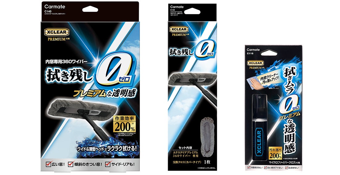 株式会社カーメイト(本社:東京都豊島区)は、車内窓専用に設計したお掃除ツール『エクスクリア プレミアム 360ワイパー(C140)』を11月9日(火)より順次発売いたしました。本製品は2017年に発売した『エクスクリア 360ワイパー(C100)』のアップグレードモデルで、ヘッドの幅を広くすることでより効率よく窓を拭くことが可能となりました。また、厚みも約47%ダウンさせたことにより傾斜がきついフロントガラスの奥まで届くようになりました。なお、本製品発売より『エクスクリア プレミアム』シリーズを新たに展開し、交換用クロスやクリーナー等ラインナップを拡充してまいります。詳細は以下をご覧ください。
