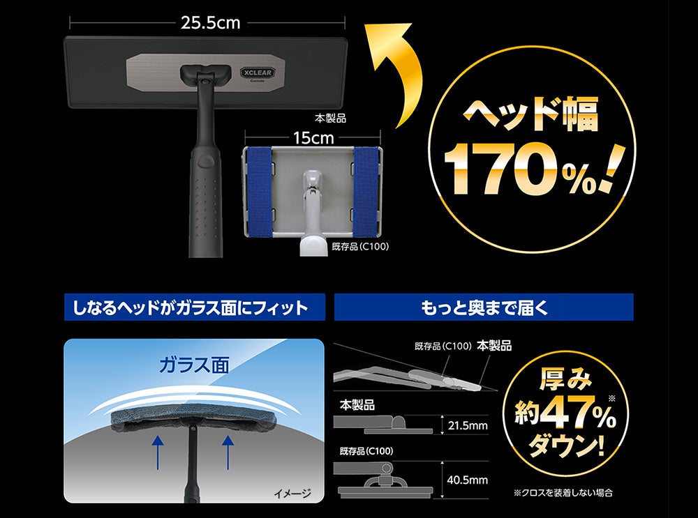 ・ヘッドの厚みは従来の約47%に。傾斜のきついフロントガラスの車でも奥まで届き、バックミラー上の隙間にも入りやすくなりました