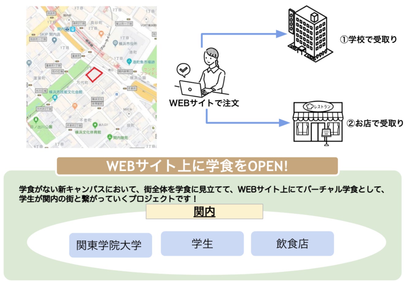 関東学院大学が今年4月に横浜市関内・関外地区に開設した新キャンパスには従来の一般的な学生食堂はなく、街全体をキャンパスと見立てて、街の飲食店の食事を日頃から食べられるようにするサービスを企画。「KGU Virtual Cafeteria Lilac」は、街の飲食店たちが一つのWEBサイト上に出店し、まるで学食のようにスマホからメニューを注文し、好きな時間に受け取れるバーチャル学食サービスです。