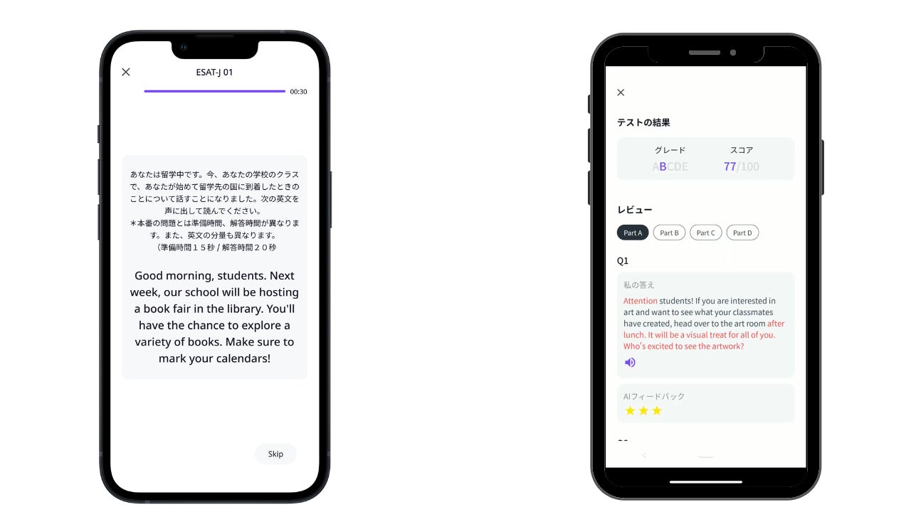 弊社はこの課題に対し、約6年間にわたる英語教育事業で培ったノウハウ、膨大なデータを活用して、各個人が安価にスピーキングテストへの対策ができるコンテンツを提供できると考え、ESAT-J対策アプリ・教材を開発しました。