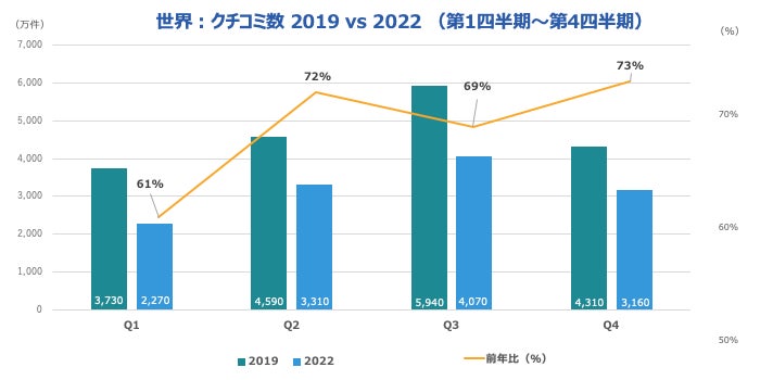 2022年、世界で最もクチコミ数が多くなった時期が、夏休みの旅行シーズンとなる第3四半期 (Q3)でした。多くの旅行者が、コロナ禍(パンデミック)に入って以来、国内旅行だけでなく久しぶりに国境を越える旅行も再開した時期です。2019年との比較値を見ると、第4四半期(Q4)の回復率が73%と最も高く、コロナ禍前のクチコミ数に最も近づいています。