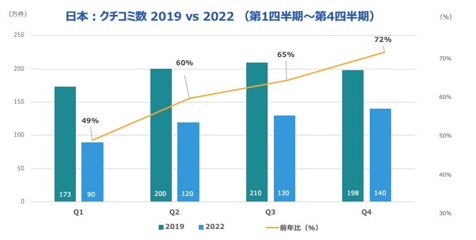 2022年における日本国内のクチコミ数の推移は、APAC(アジア太平洋)地域内でも、とても速いペースでの回復を見せ、第4四半期には2019年比で72%まで回復しています。この伸びは、地域別の重点措置といったコロナ関連規制の解除や、全国旅行支援などの自治体の旅行換気施策により、国内旅行が本格的に再開されたことにあります。