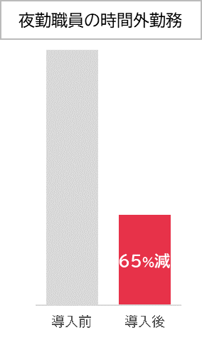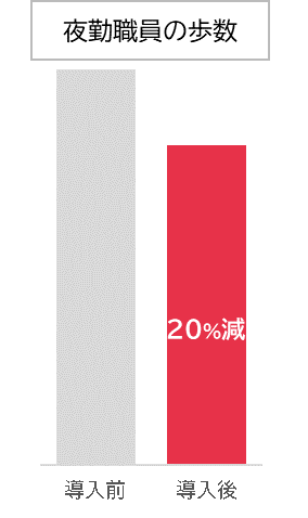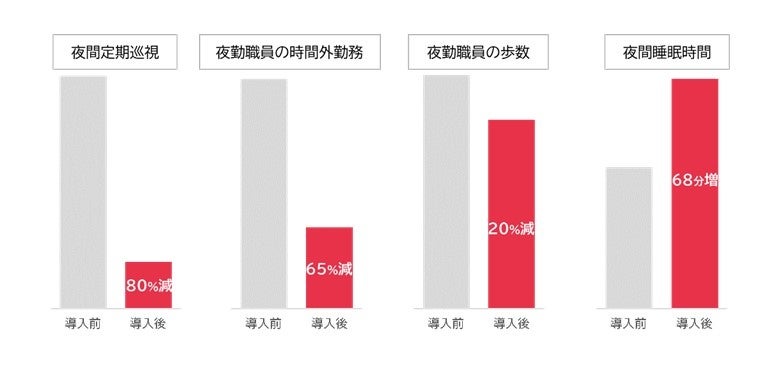 検証の結果、安定した通信で起上検知による転倒事故予防や在床状況の把握が可能になり、導入前に比べ、職員の夜間定期巡視回数が80%減、夜勤職員の時間外勤務時間が65%減、夜間職員の移動歩数が20%減、入居者の夜間睡眠時間が68分増※と、介護職員の負担軽減と入居者の健康維持に貢献できることが分かりました。