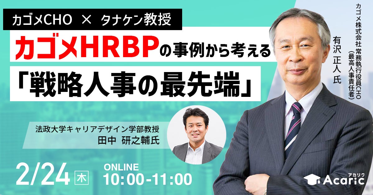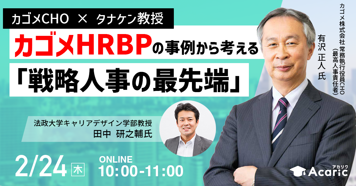 大学院生・研究者のキャリア支援を行っている株式会社アカリク(本社:東京都渋谷区、代表取締役:山田 諒、以下「弊社」)は、カゴメ株式会社 常務執行役員CHO 有沢氏と、法政大学教授の田中氏をゲストとしてお迎えし、『カゴメHRBPの事例から考える「戦略人事の最先端」』と題した戦略人事に関するウェビナーを開催いたします。