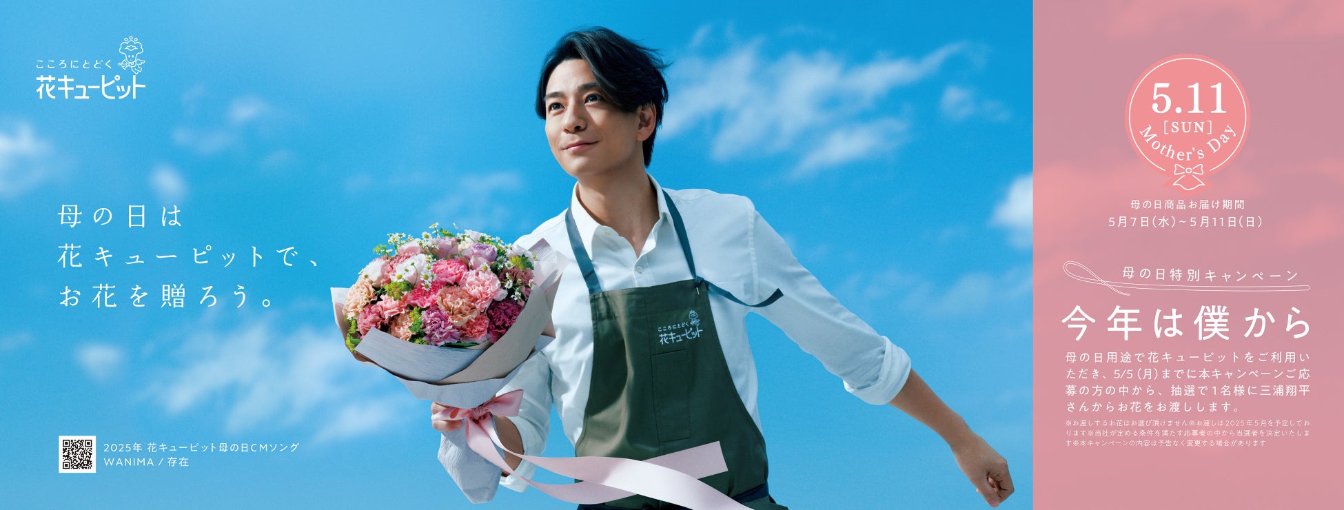 「母の日特別キャンペーン」として、花キューピット加盟店または花キューピットのオンラインストアで母の日のお花を購入し、ご応募いただいた方から抽選で1名様に三浦翔平さんからお花をお渡しいたします。そのほか、三浦翔平さんサイン入りポスター・チェキプリント、Amazonギフトカード、花とみどりのeギフトが当たるキャンペーンも実施いたします。