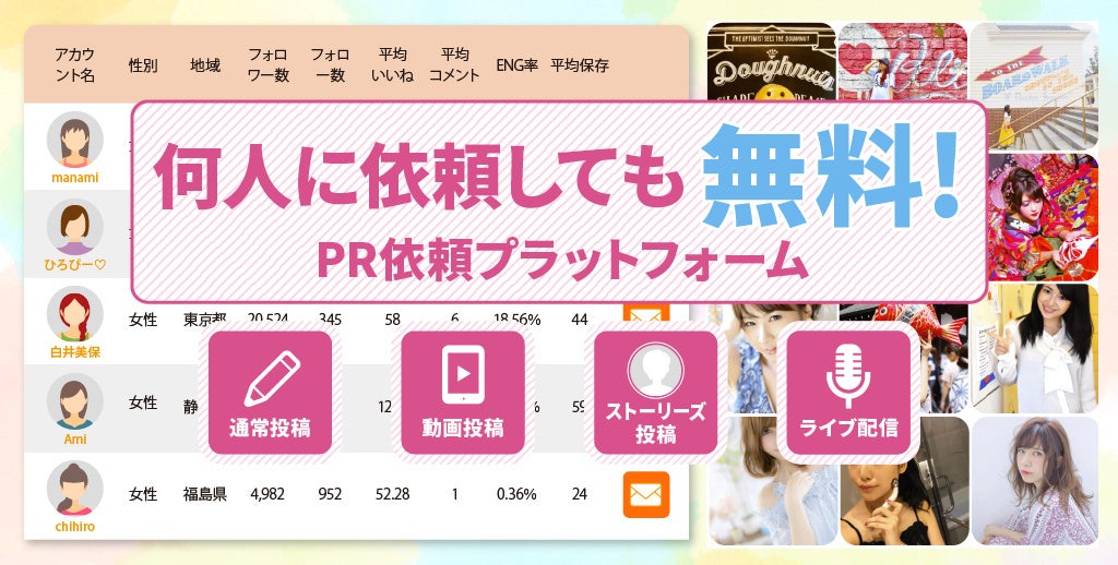 PR依頼プラットフォームでは、PRしたい商品やサービスの内容、性別やフォロワー数などの、募集したいインフルエンサーの条件や人数、PR時期や付けたいハッシュタグなどの条件を入力して募集するだけです。通常投稿によるPRだけでなく、動画投稿、ストーリーズ投稿、ライブ配信など、様々なPRの依頼が可能です。