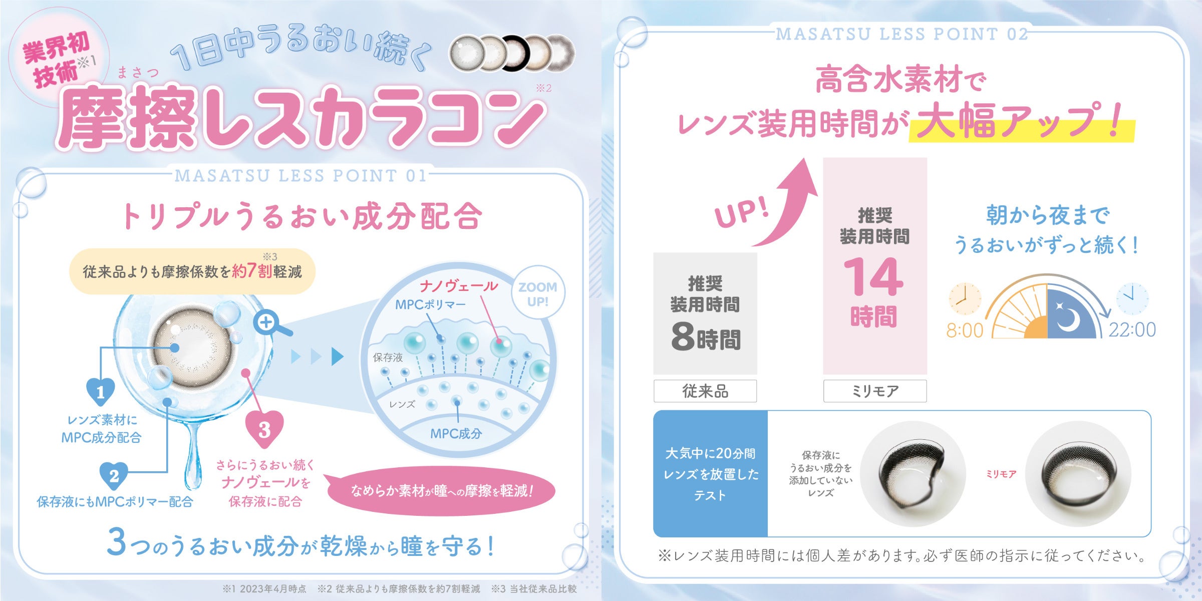 ミリモアシリーズは業界初技術(※1)「摩擦レスカラコン」(※2)。