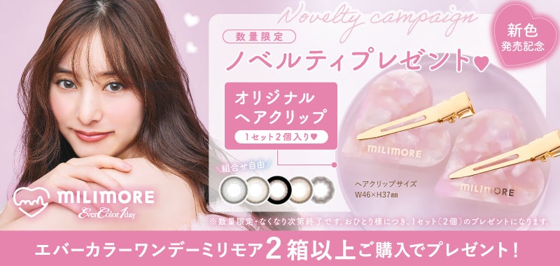 対象のWEB店舗にてエバーカラーワンデーミリモアを2箱以上お買い求め頂いたお客様に、先着でエバーカラーワンデーミリモアオリジナルヘアクリップを1セットプレゼントいたします。
