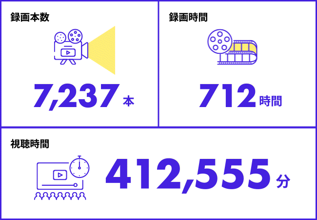 recitを多部署・多用途でご活用いただいた結果、正式リリース後1年で作成された動画の本数は7,237本(1日あたり約20本)に及び、動画を使った「わかりやすく、効率的」なビジネスコミュニケーションを推進しています。