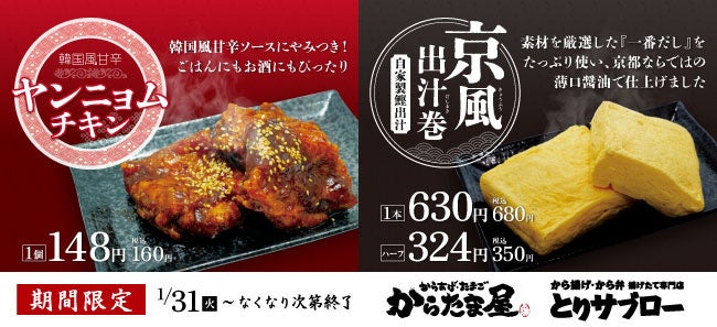京都北白川ラーメン魁力屋をチェーン展開する株式会社魁力屋(http://www.kairikiya.co.jp本社:京都市中京区、代表取締役社長:藤田 宗、以下魁力屋)は、持ち帰りから揚げ専門店「からたま屋」「とりサブロー」にて、2023年1月31日(火)~「ヤンニョムチキン」「京風出汁巻」を期間限定で販売いたします。