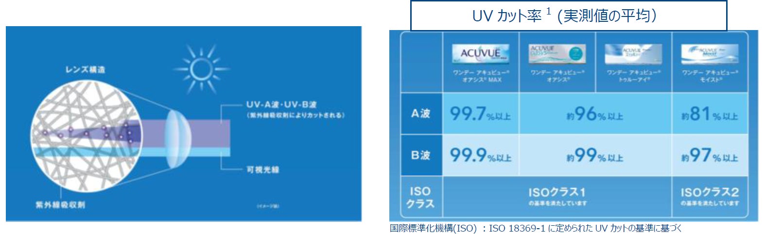 1. Johnson & Johnson VISION CARE, INC. データより。UV吸収剤を配合したコンタクトレンズは、UV吸収サングラスなどの代わりにはなりません。本製品の使用と、紫外線に起因する眼障害リスクの低減の関係については、臨床試験において確認されておりません。